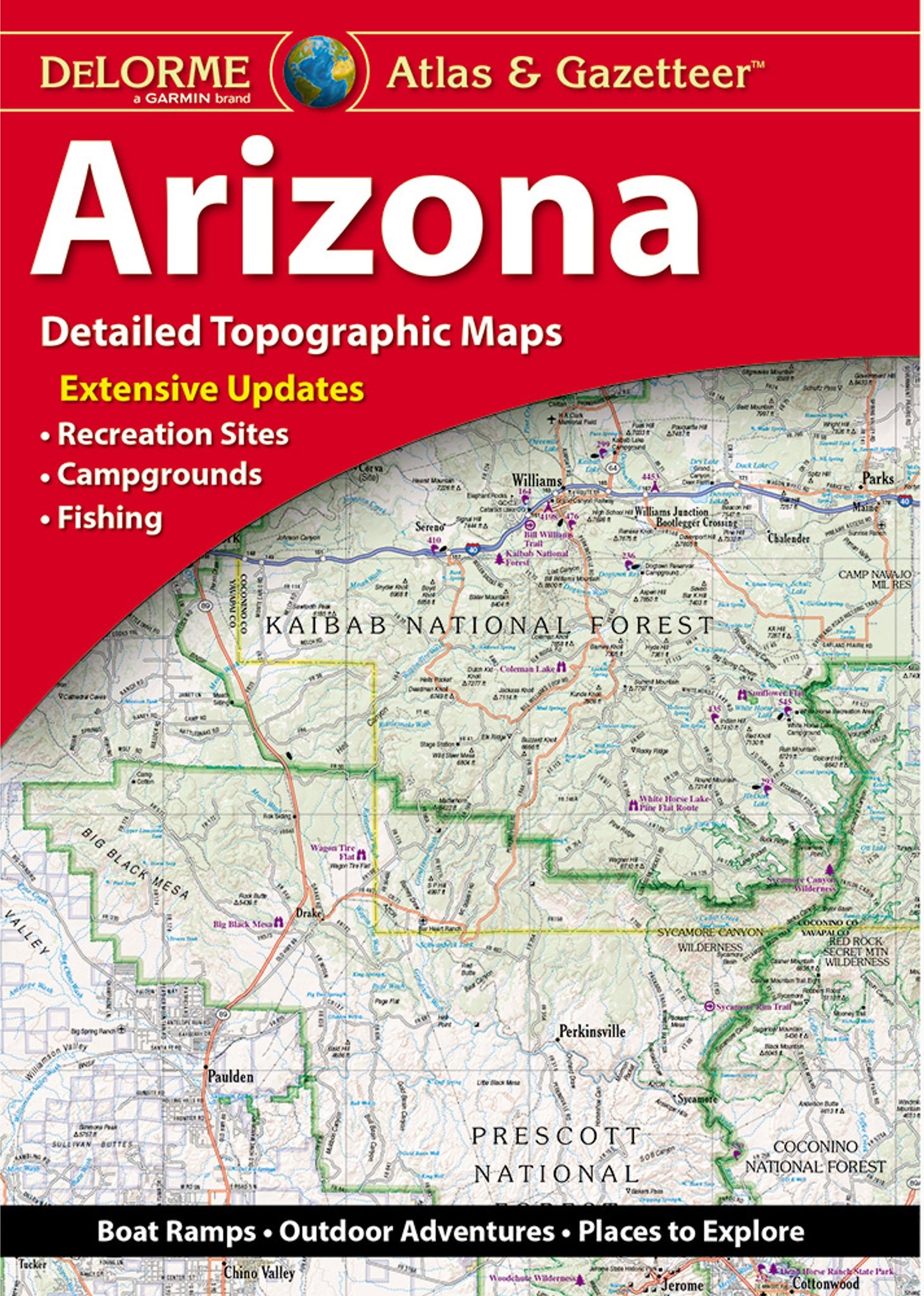 Features detailed topo maps of the entire state, including: Tucson, Saguaro National Park, Meteor Crater, Petrified Forest National Park, Flagstaff, Antelope Canyon, Canyon de Chelly, Monument Valley, Sedona, Grand Canyon