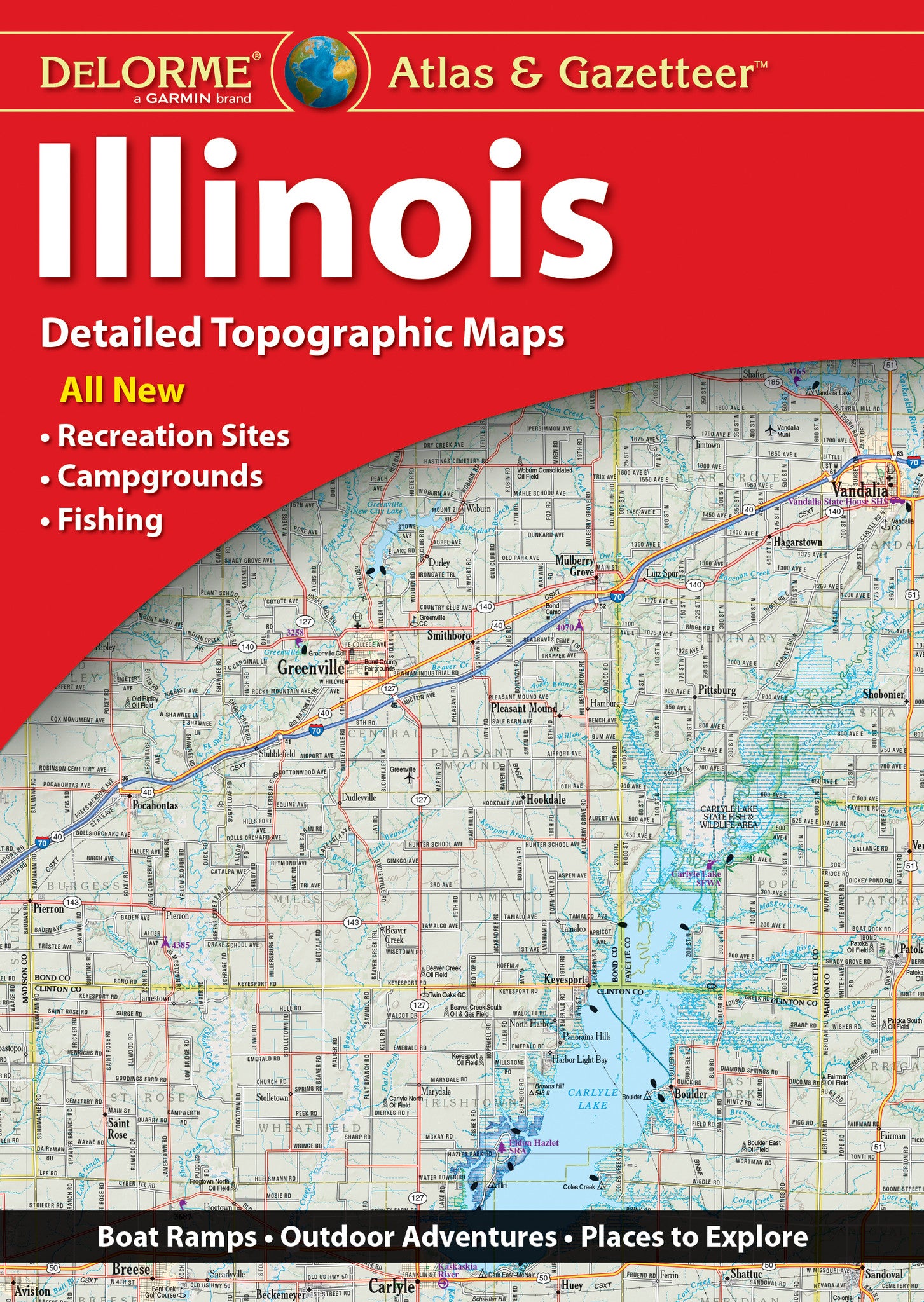 Features detailed topo maps of the entire state, including: Anderson Japanese Gardens, Champaign-Urbana, Tunnel Hill State Trail, Lincoln's New Salem, Shawnee National Forest, Cahokia Mounds, Starved Rock State Park, Galena, Springfield, Chicago