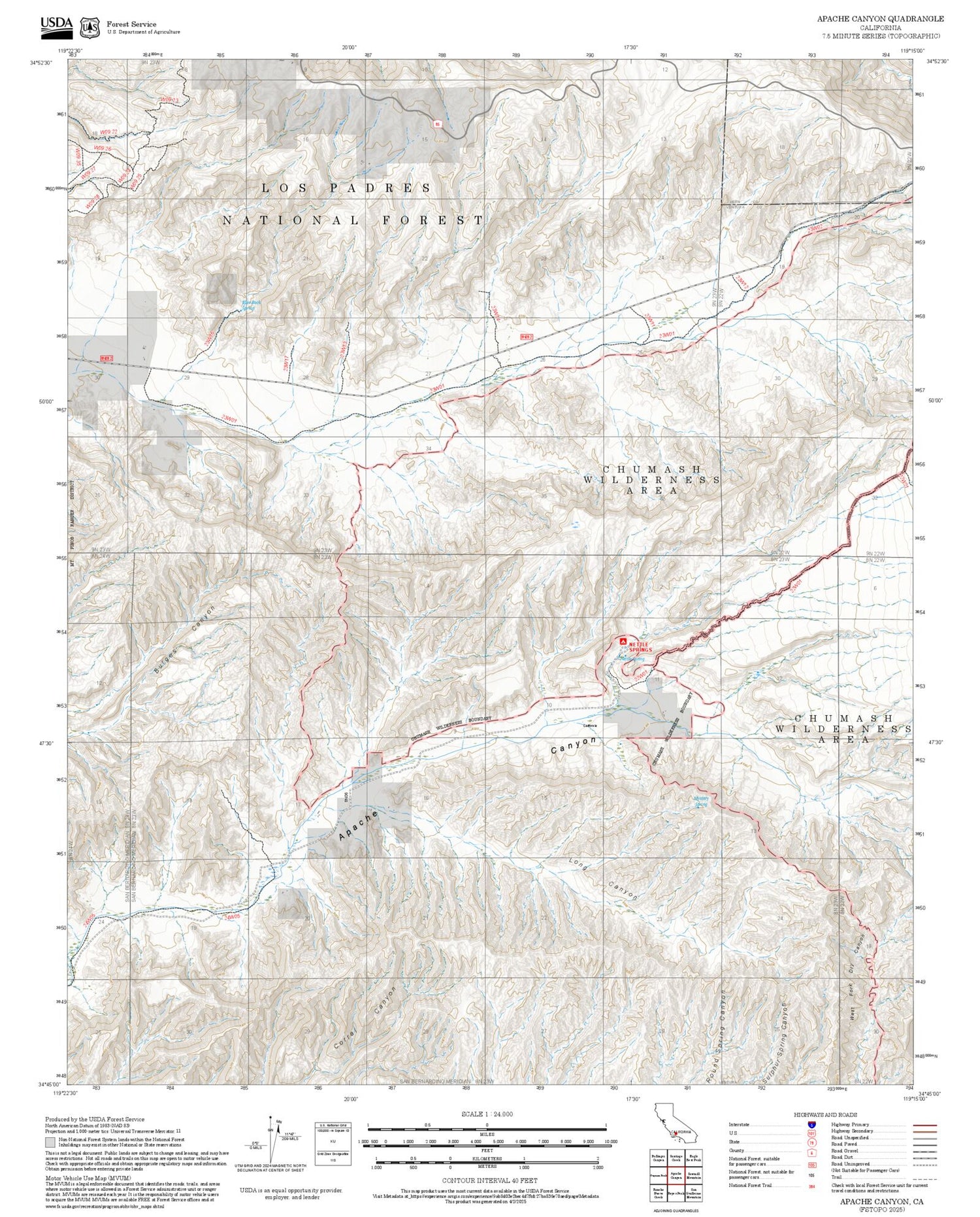 This 2025 FS Topo topographic map of Apache Canyon in the state of California is a quad print with shaded relief, up-to-date and ready for any adventure. Printed on waterproof paper, it shows all Forest Service roads, trails, campgrounds, trailheads, water features, and contour lines in high detail. It is an ideal guide to USFS recreational features for your wilderness adventures.