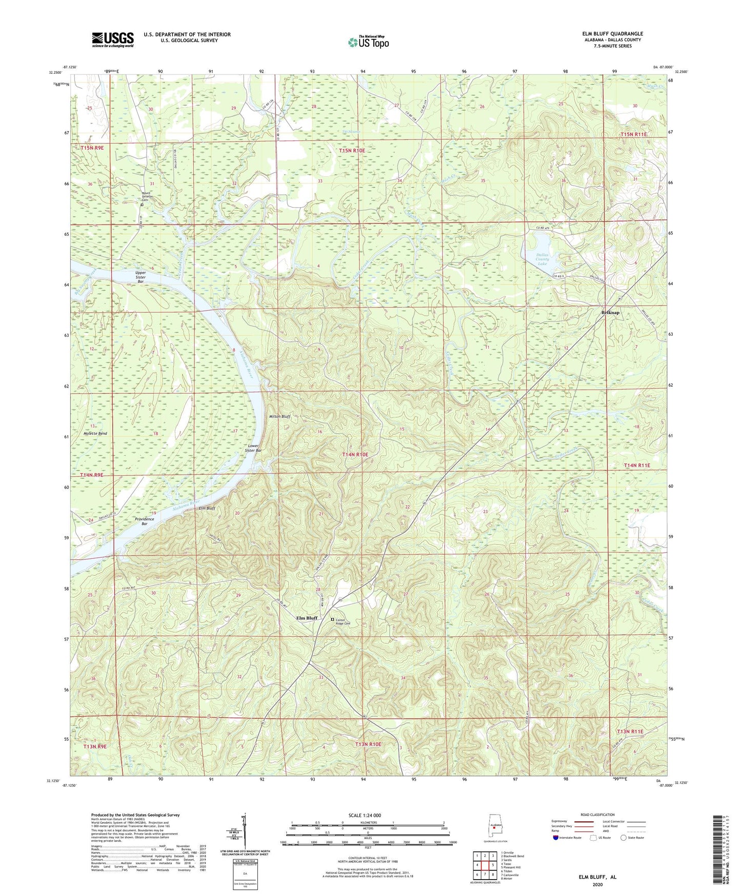 2024 topographic map quadrangle Elm Bluff in the state of Alabama. Scale: 1:24000. Based on the newly updated USGS 7.5' US Topo map series, this map is in the following counties: Dallas. The map contains contour data, water features, and other items you are used to seeing on USGS maps, but also has updated roads and other features. This is the next generation of topographic maps. Printed on high-quality waterproof paper with UV fade-resistant inks.