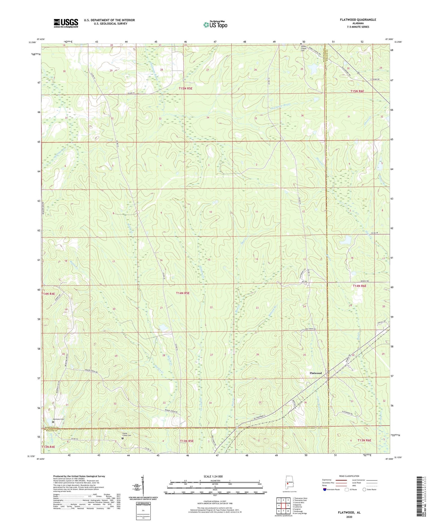 2024 topographic map quadrangle Flatwood in the state of Alabama. Scale: 1:24000. Based on the newly updated USGS 7.5' US Topo map series, this map is in the following counties: Marengo, Wilcox. The map contains contour data, water features, and other items you are used to seeing on USGS maps, but also has updated roads and other features. This is the next generation of topographic maps. Printed on high-quality waterproof paper with UV fade-resistant inks.