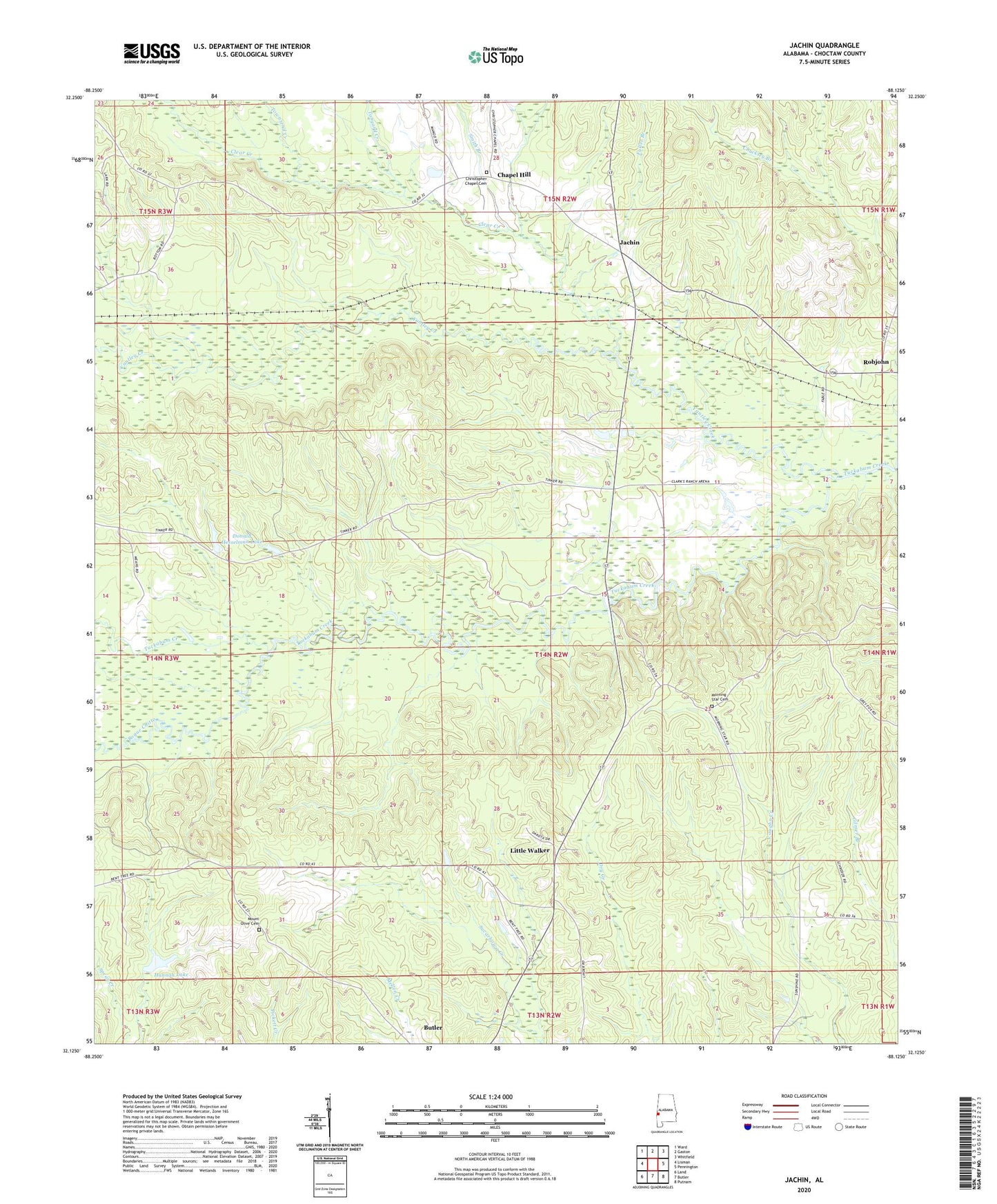 2024 topographic map quadrangle Jachin in the state of Alabama. Scale: 1:24000. Based on the newly updated USGS 7.5' US Topo map series, this map is in the following counties: Choctaw. The map contains contour data, water features, and other items you are used to seeing on USGS maps, but also has updated roads and other features. This is the next generation of topographic maps. Printed on high-quality waterproof paper with UV fade-resistant inks.