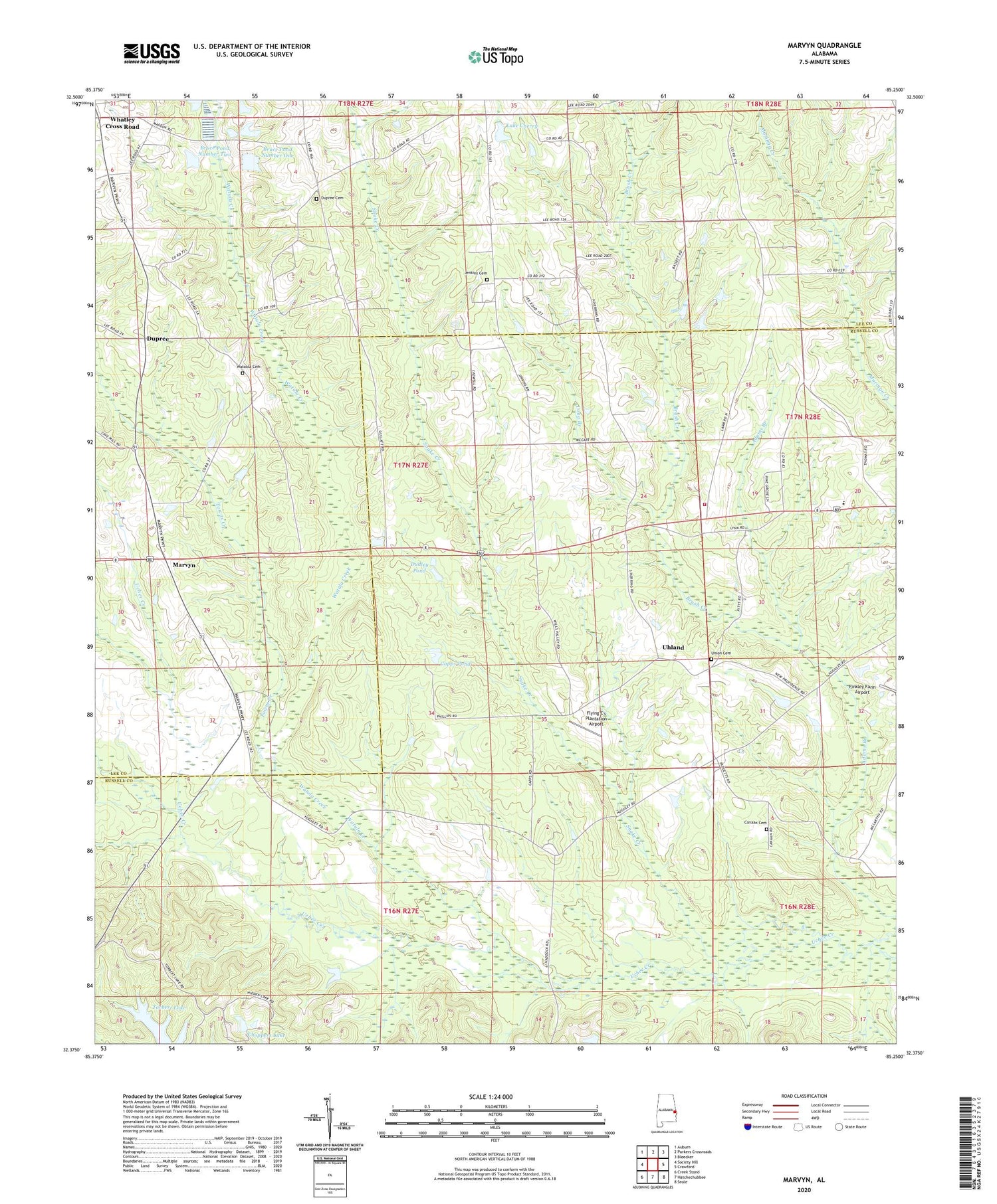 2024 topographic map quadrangle Marvyn in the state of Alabama. Scale: 1:24000. Based on the newly updated USGS 7.5' US Topo map series, this map is in the following counties: Russell, Lee. The map contains contour data, water features, and other items you are used to seeing on USGS maps, but also has updated roads and other features. This is the next generation of topographic maps. Printed on high-quality waterproof paper with UV fade-resistant inks.
