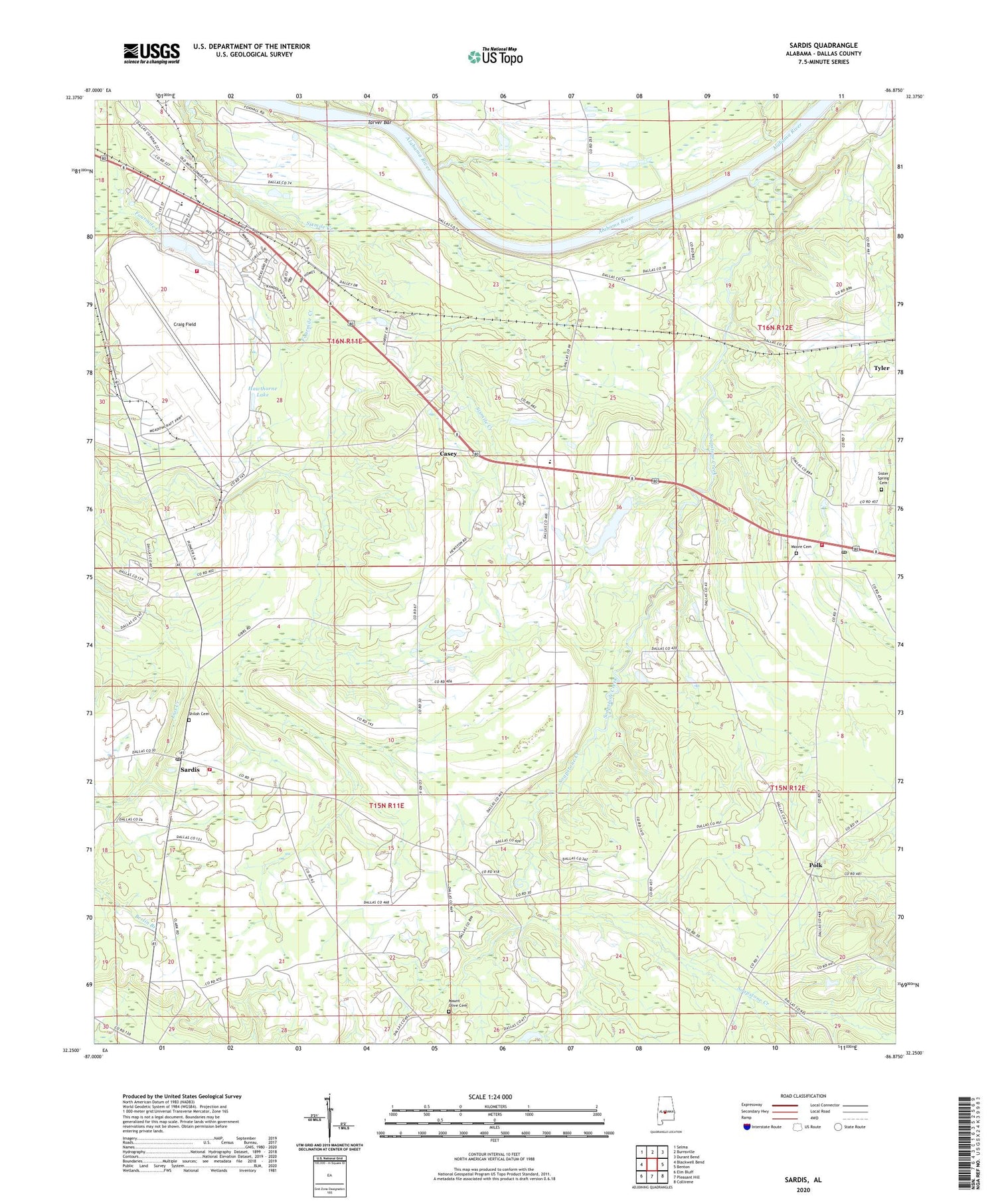 2024 topographic map quadrangle Sardis in the state of Alabama. Scale: 1:24000. Based on the newly updated USGS 7.5' US Topo map series, this map is in the following counties: Dallas. The map contains contour data, water features, and other items you are used to seeing on USGS maps, but also has updated roads and other features. This is the next generation of topographic maps. Printed on high-quality waterproof paper with UV fade-resistant inks.