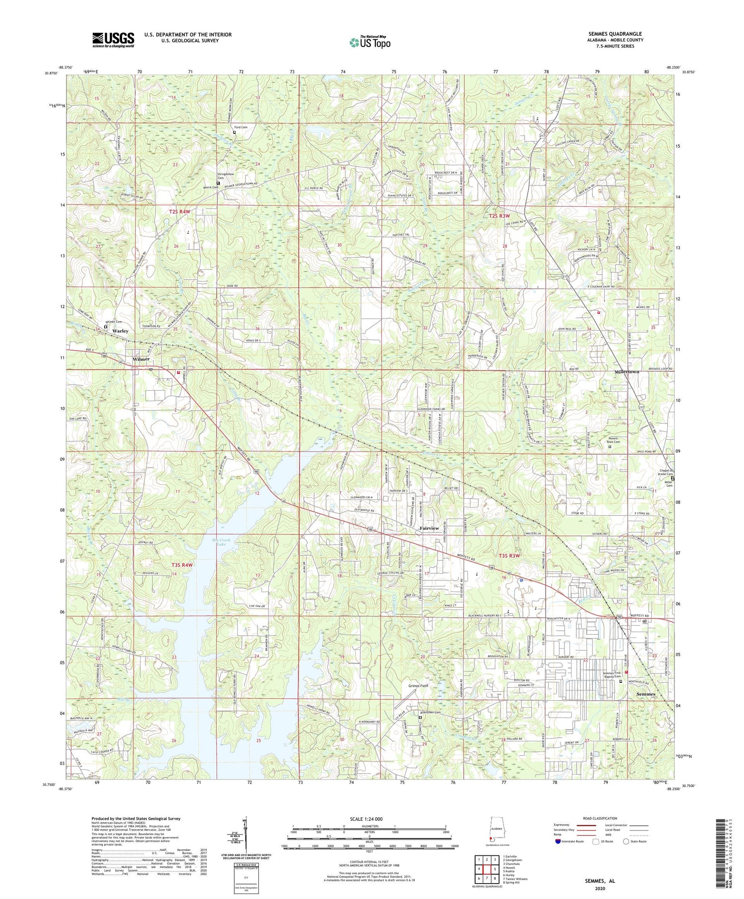 2024 topographic map quadrangle Semmes in the state of Alabama. Scale: 1:24000. Based on the newly updated USGS 7.5' US Topo map series, this map is in the following counties: Mobile. The map contains contour data, water features, and other items you are used to seeing on USGS maps, but also has updated roads and other features. This is the next generation of topographic maps. Printed on high-quality waterproof paper with UV fade-resistant inks.