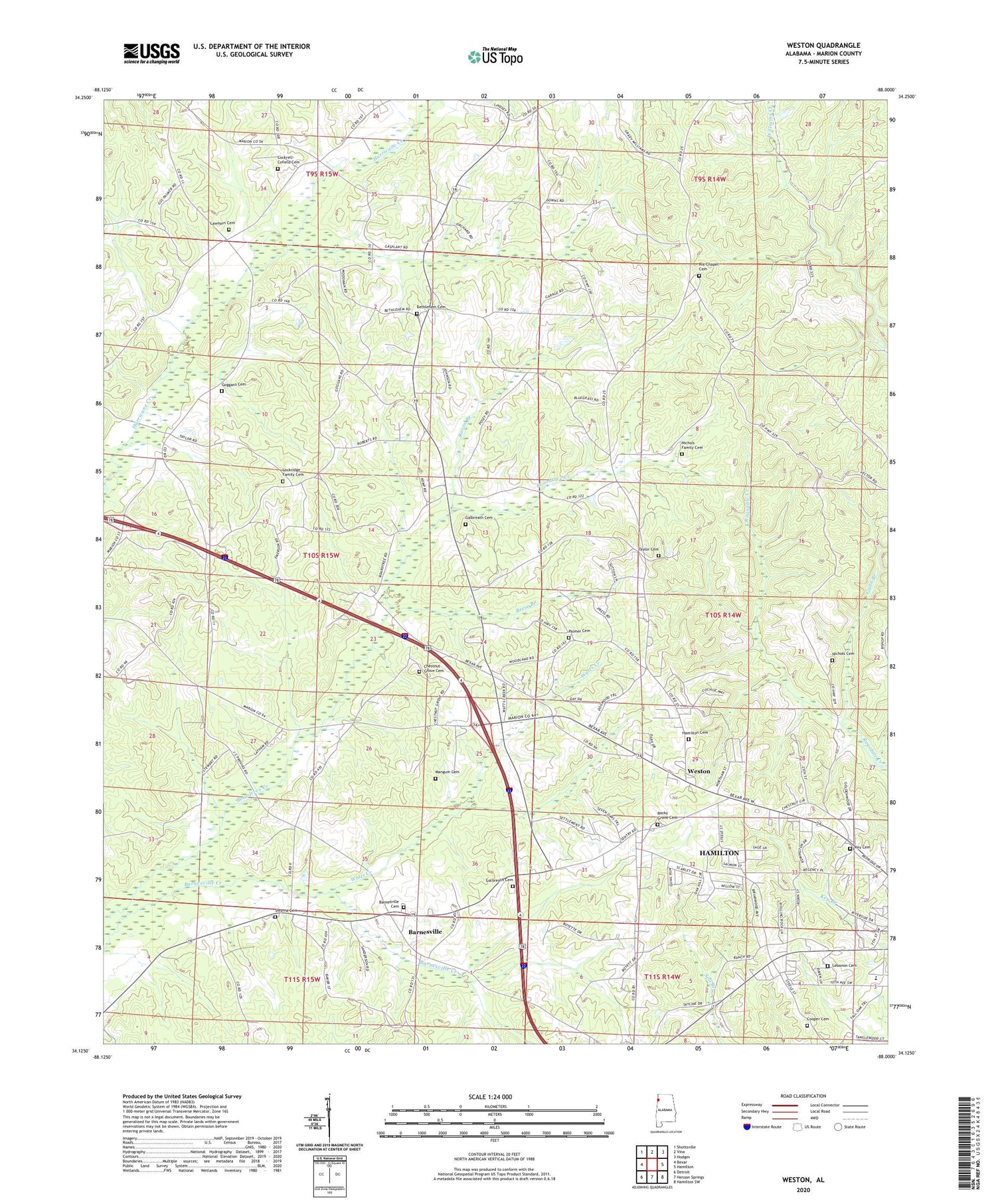 2024 topographic map quadrangle Weston in the state of Alabama. Scale: 1:24000. Based on the newly updated USGS 7.5' US Topo map series, this map is in the following counties: Marion. The map contains contour data, water features, and other items you are used to seeing on USGS maps, but also has updated roads and other features. This is the next generation of topographic maps. Printed on high-quality waterproof paper with UV fade-resistant inks.