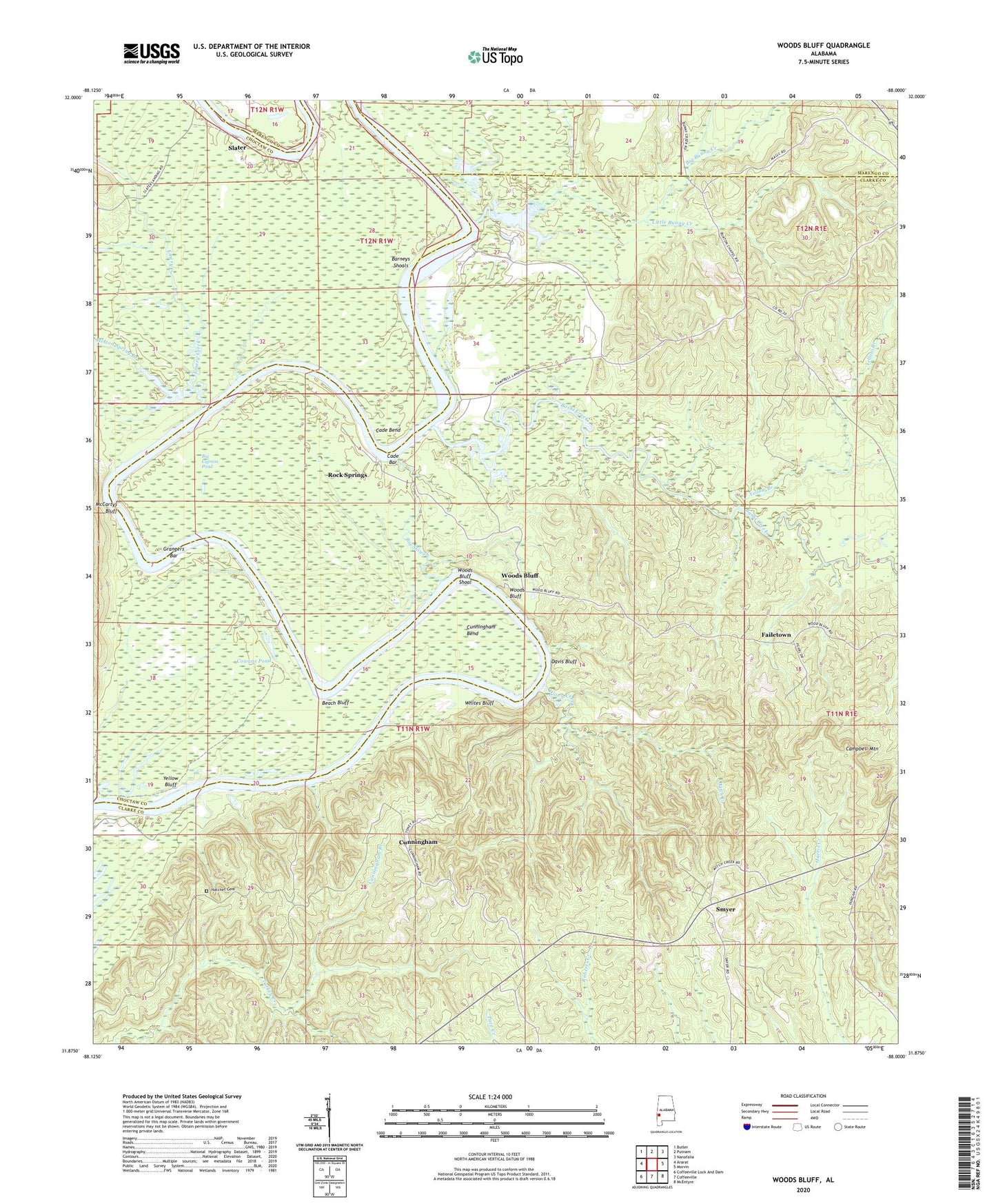 2024 topographic map quadrangle Woods Bluff in the state of Alabama. Scale: 1:24000. Based on the newly updated USGS 7.5' US Topo map series, this map is in the following counties: Clarke, Choctaw, Marengo. The map contains contour data, water features, and other items you are used to seeing on USGS maps, but also has updated roads and other features. This is the next generation of topographic maps. Printed on high-quality waterproof paper with UV fade-resistant inks.