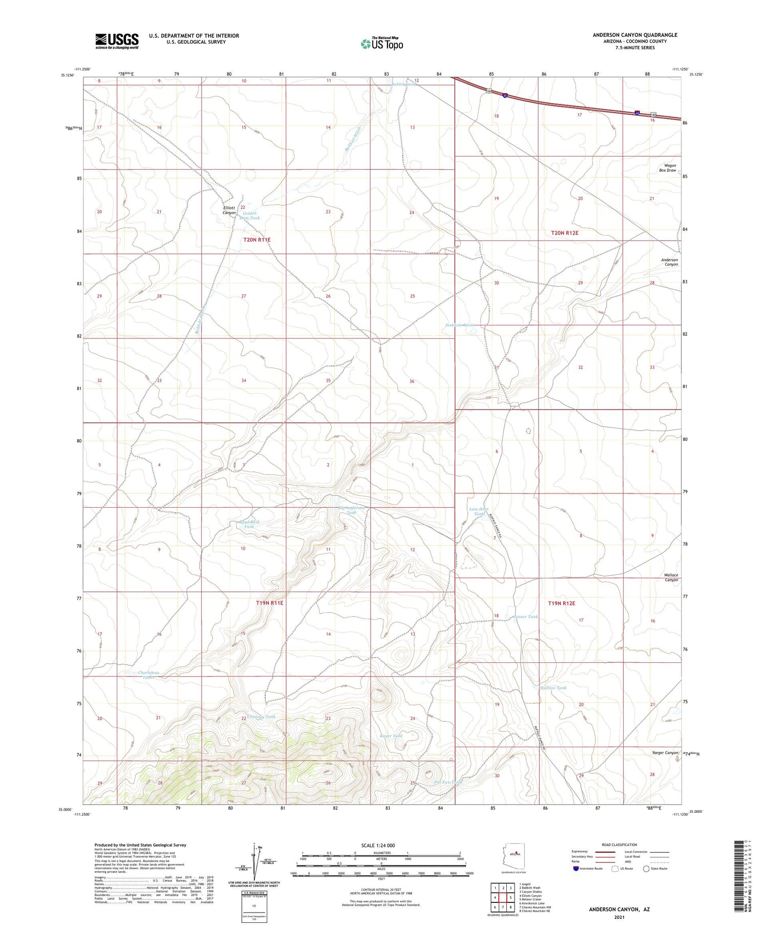 2021 topographic map quadrangle Anderson Canyon in the state of Arizona. Scale: 1:24000. Based on the newly updated USGS 7.5' US Topo map series, this map is in the following counties: Coconino. The map contains contour data, water features, and other items you are used to seeing on USGS maps, but also has updated roads and other features. This is the next generation of topographic maps. Printed on high-quality waterproof paper with UV fade-resistant inks.
