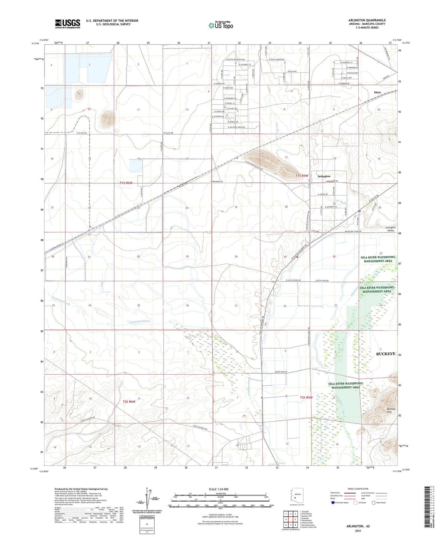 2021 topographic map quadrangle Arlington in the state of Arizona. Scale: 1:24000. Based on the newly updated USGS 7.5' US Topo map series, this map is in the following counties: Maricopa. The map contains contour data, water features, and other items you are used to seeing on USGS maps, but also has updated roads and other features. This is the next generation of topographic maps. Printed on high-quality waterproof paper with UV fade-resistant inks.