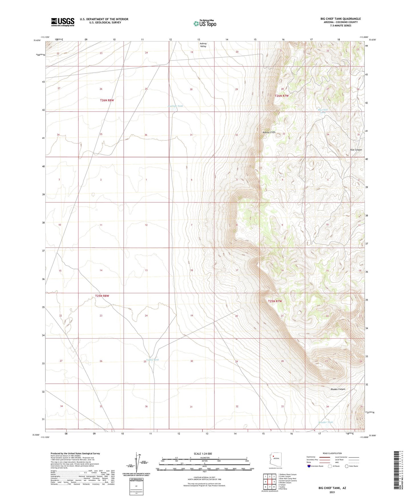 2021 topographic map quadrangle Big Chief Tank in the state of Arizona. Scale: 1:24000. Based on the newly updated USGS 7.5' US Topo map series, this map is in the following counties: Coconino. The map contains contour data, water features, and other items you are used to seeing on USGS maps, but also has updated roads and other features. This is the next generation of topographic maps. Printed on high-quality waterproof paper with UV fade-resistant inks.