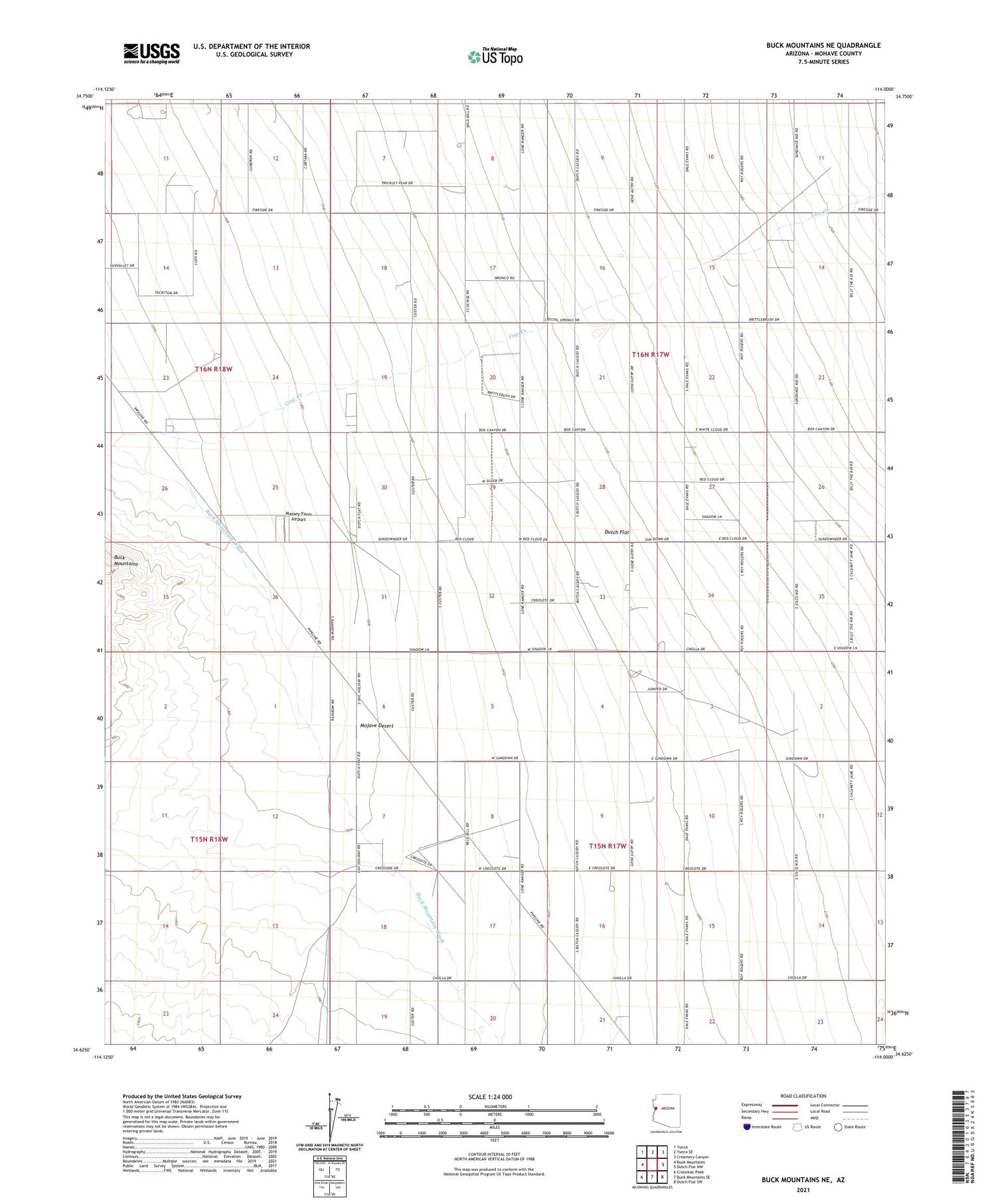 2021 topographic map quadrangle Buck Mountains NE in the state of Arizona. Scale: 1:24000. Based on the newly updated USGS 7.5' US Topo map series, this map is in the following counties: Mohave. The map contains contour data, water features, and other items you are used to seeing on USGS maps, but also has updated roads and other features. This is the next generation of topographic maps. Printed on high-quality waterproof paper with UV fade-resistant inks.