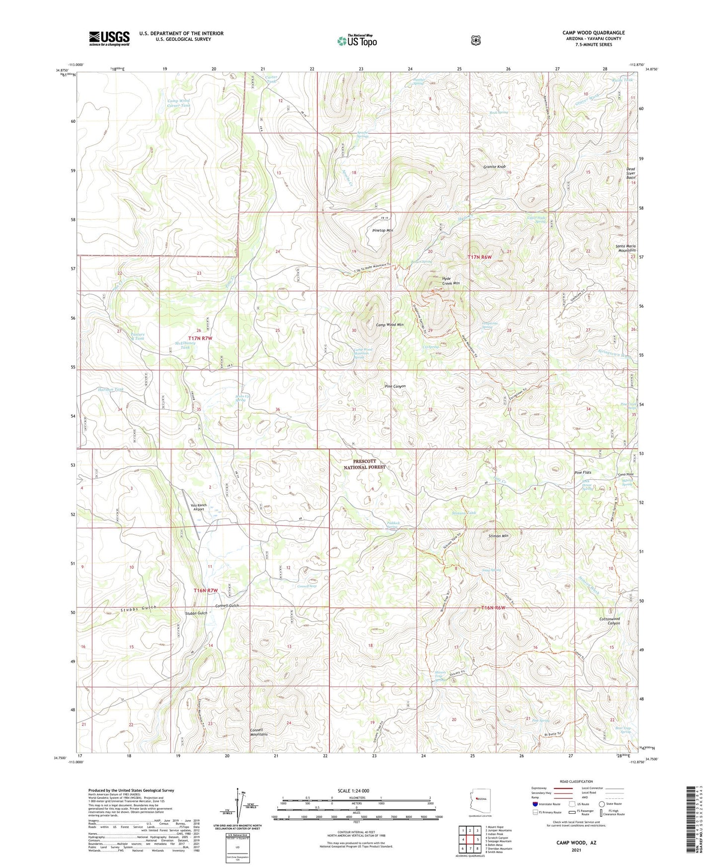 2021 topographic map quadrangle Camp Wood in the state of Arizona. Scale: 1:24000. Based on the newly updated USGS 7.5' US Topo map series, this map is in the following counties: Yavapai. The map contains contour data, water features, and other items you are used to seeing on USGS maps, but also has updated roads and other features. This is the next generation of topographic maps. Printed on high-quality waterproof paper with UV fade-resistant inks.