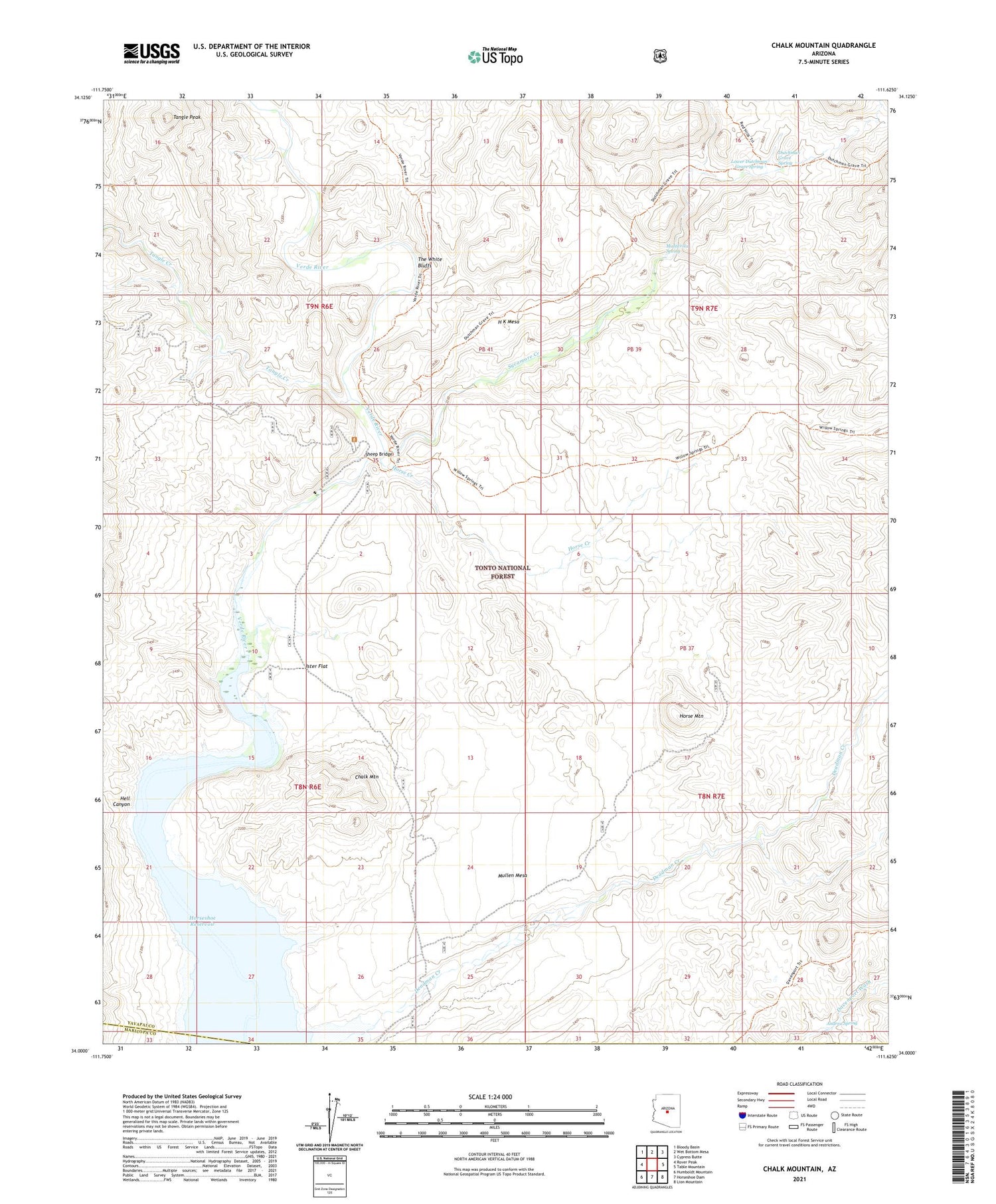 2021 topographic map quadrangle Chalk Mountain in the state of Arizona. Scale: 1:24000. Based on the newly updated USGS 7.5' US Topo map series, this map is in the following counties: Yavapai, Maricopa. The map contains contour data, water features, and other items you are used to seeing on USGS maps, but also has updated roads and other features. This is the next generation of topographic maps. Printed on high-quality waterproof paper with UV fade-resistant inks.