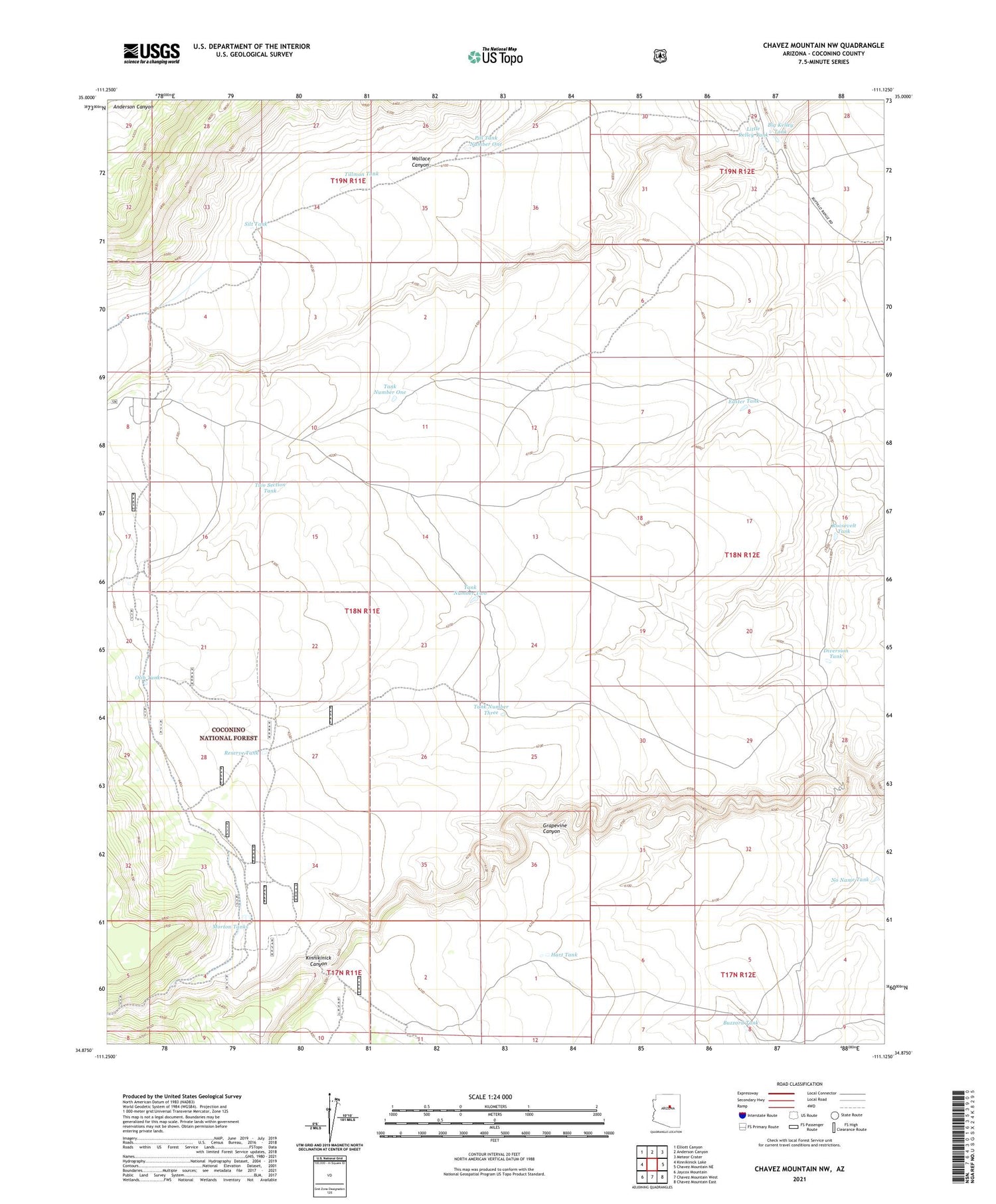 2021 topographic map quadrangle Chavez Mountain NW in the state of Arizona. Scale: 1:24000. Based on the newly updated USGS 7.5' US Topo map series, this map is in the following counties: Coconino. The map contains contour data, water features, and other items you are used to seeing on USGS maps, but also has updated roads and other features. This is the next generation of topographic maps. Printed on high-quality waterproof paper with UV fade-resistant inks.