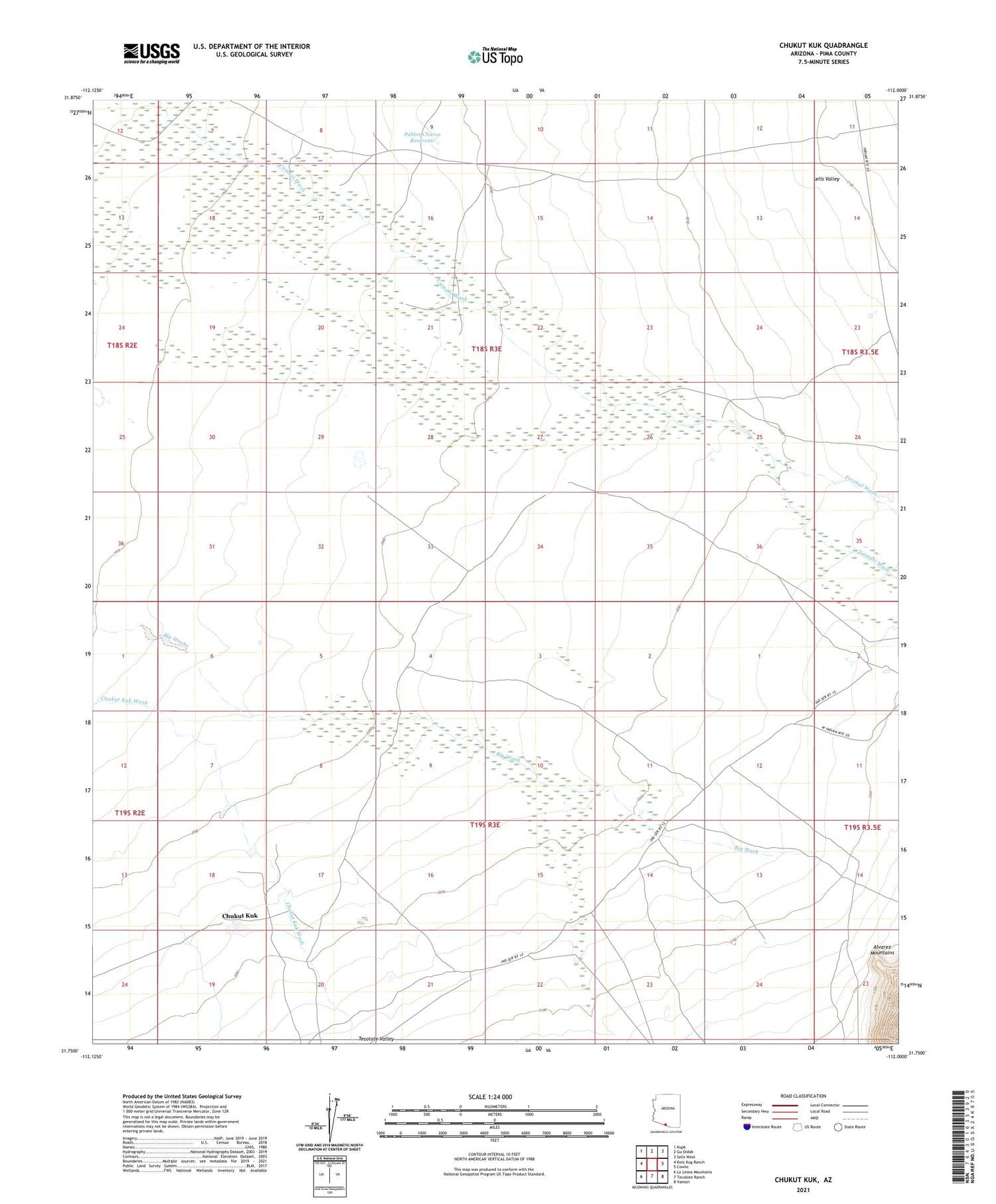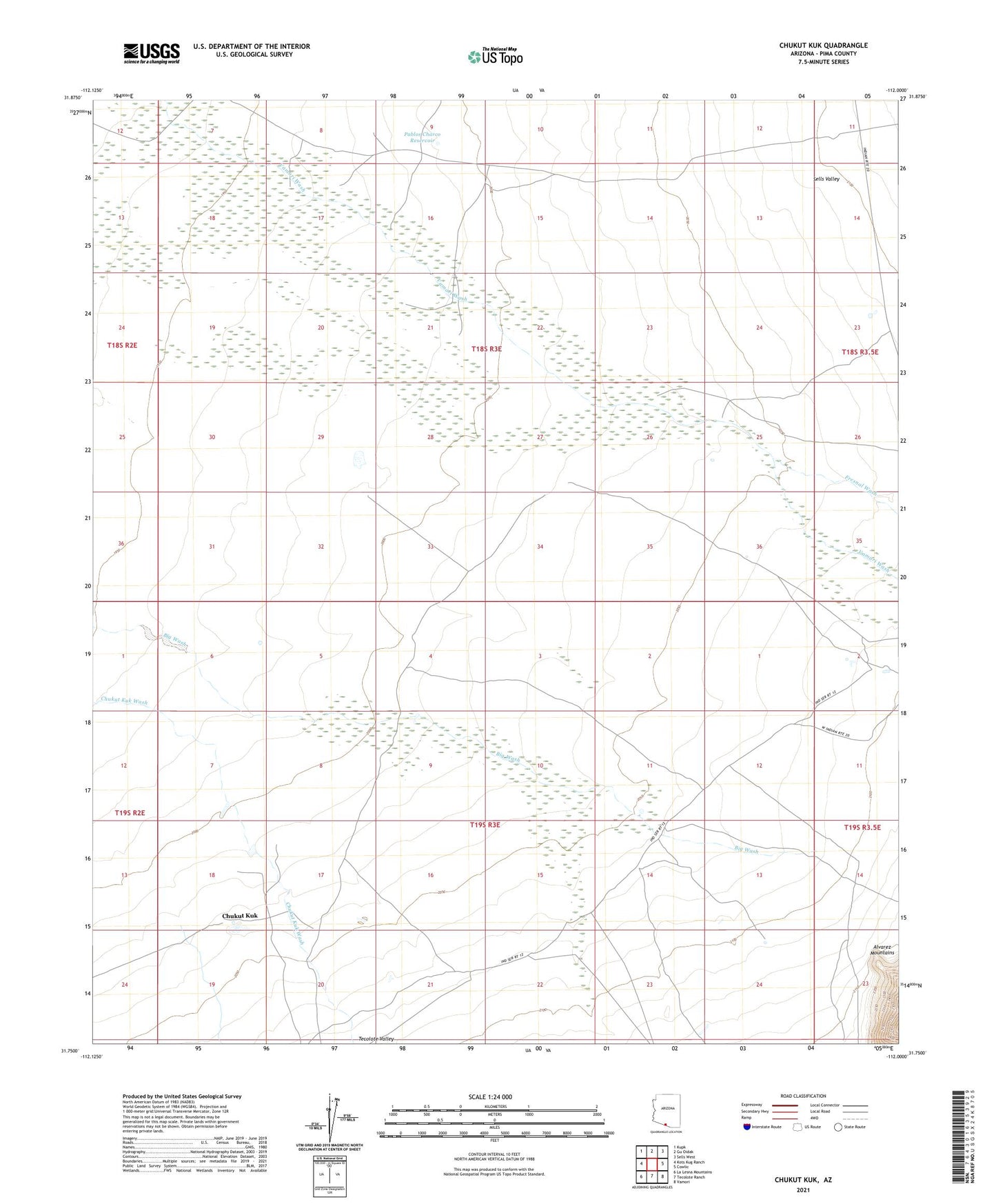 2021 topographic map quadrangle Chukut Kuk in the state of Arizona. Scale: 1:24000. Based on the newly updated USGS 7.5' US Topo map series, this map is in the following counties: Pima. The map contains contour data, water features, and other items you are used to seeing on USGS maps, but also has updated roads and other features. This is the next generation of topographic maps. Printed on high-quality waterproof paper with UV fade-resistant inks.
