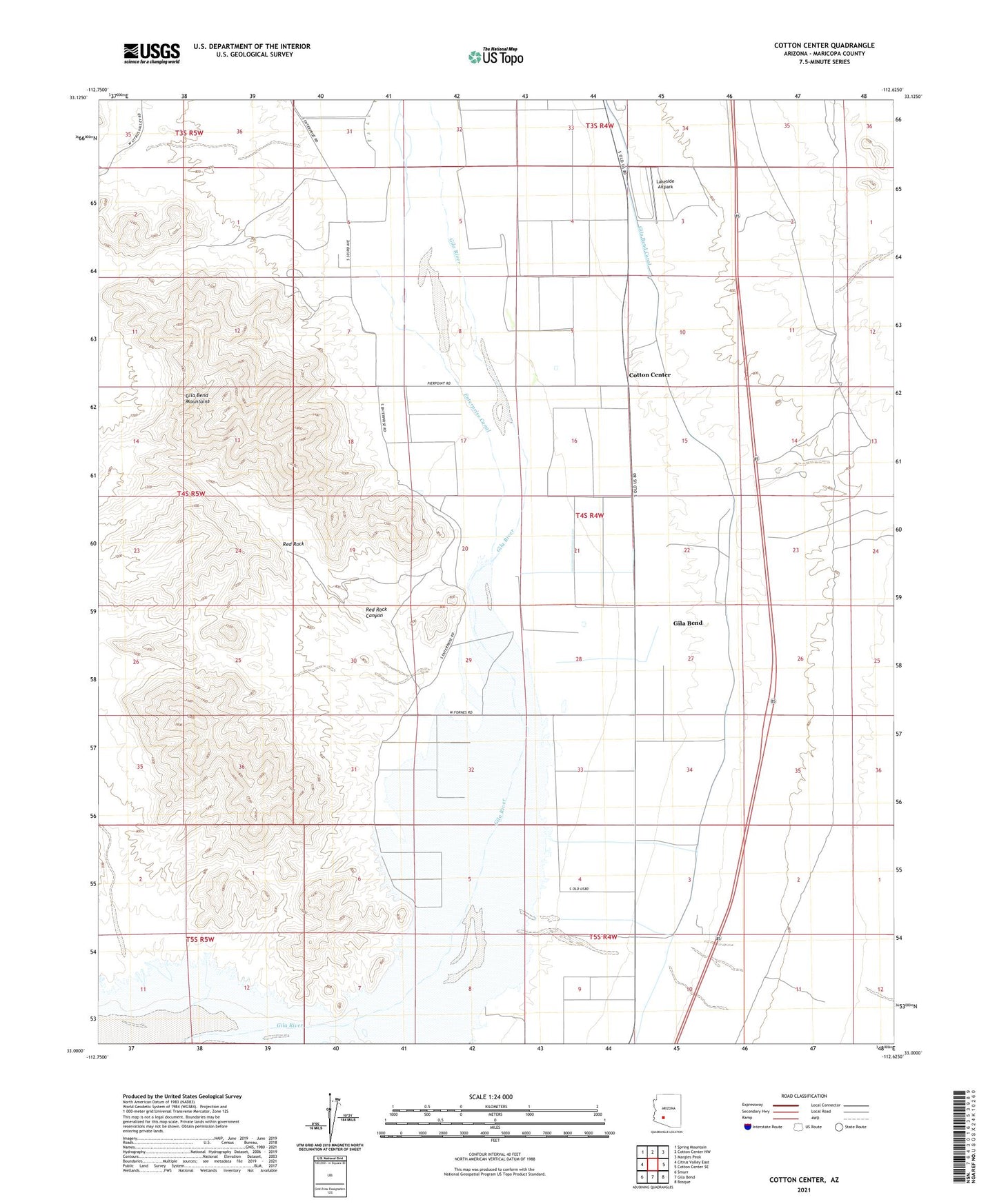 2021 topographic map quadrangle Cotton Center in the state of Arizona. Scale: 1:24000. Based on the newly updated USGS 7.5' US Topo map series, this map is in the following counties: Maricopa. The map contains contour data, water features, and other items you are used to seeing on USGS maps, but also has updated roads and other features. This is the next generation of topographic maps. Printed on high-quality waterproof paper with UV fade-resistant inks.