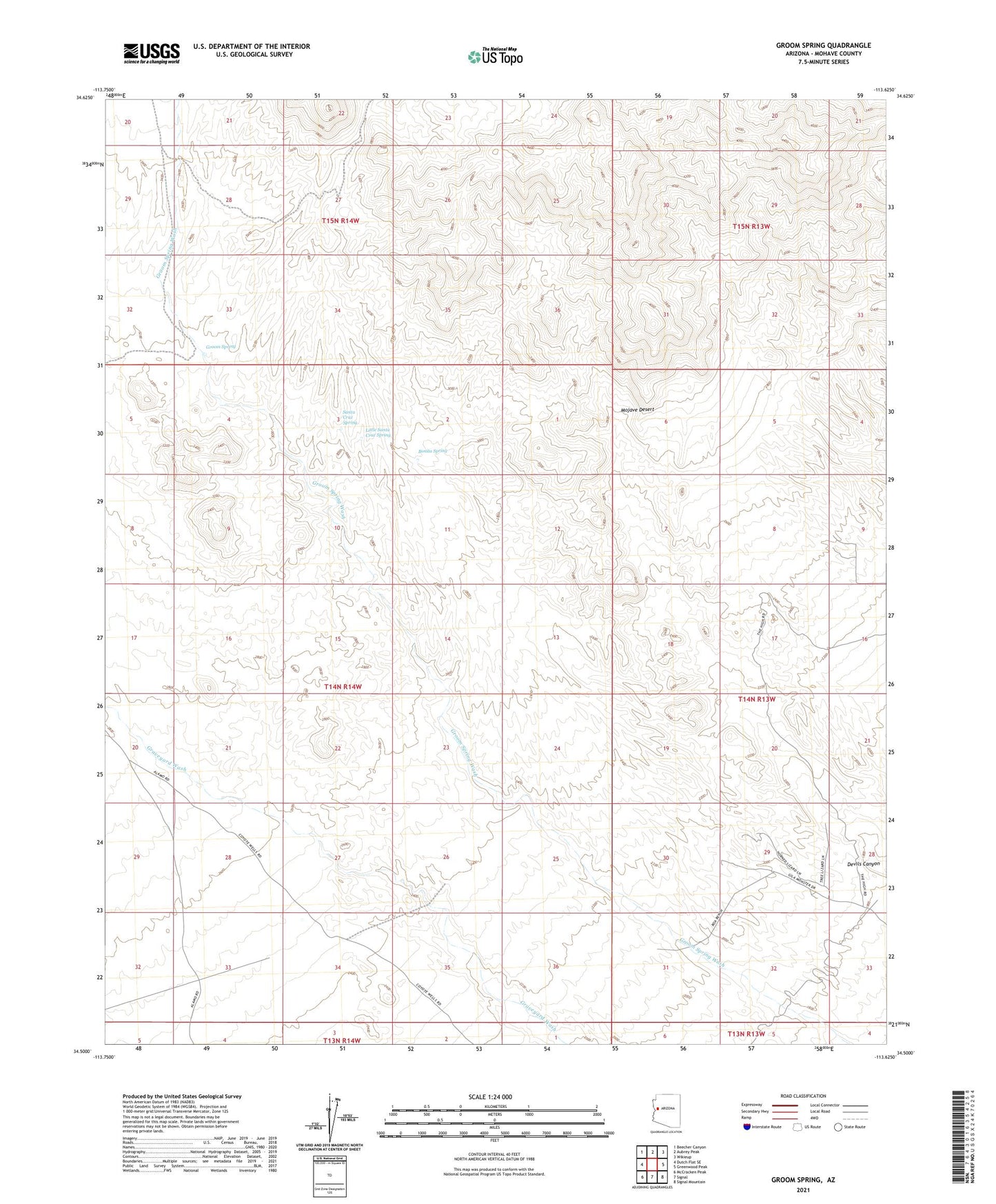 2021 topographic map quadrangle Groom Spring in the state of Arizona. Scale: 1:24000. Based on the newly updated USGS 7.5' US Topo map series, this map is in the following counties: Mohave. The map contains contour data, water features, and other items you are used to seeing on USGS maps, but also has updated roads and other features. This is the next generation of topographic maps. Printed on high-quality waterproof paper with UV fade-resistant inks.