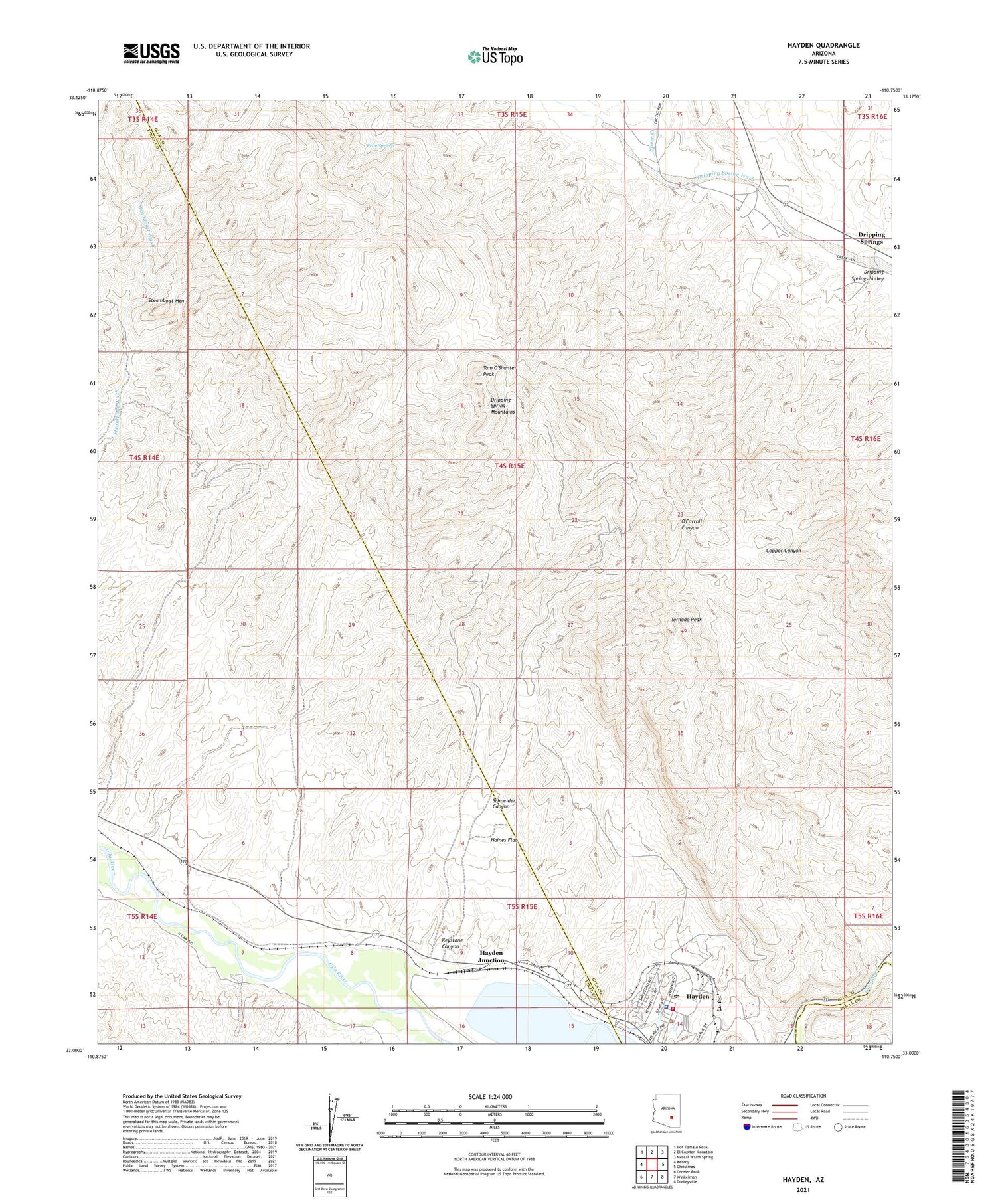 2021 topographic map quadrangle Hayden in the state of Arizona. Scale: 1:24000. Based on the newly updated USGS 7.5' US Topo map series, this map is in the following counties: Gila, Pinal. The map contains contour data, water features, and other items you are used to seeing on USGS maps, but also has updated roads and other features. This is the next generation of topographic maps. Printed on high-quality waterproof paper with UV fade-resistant inks.