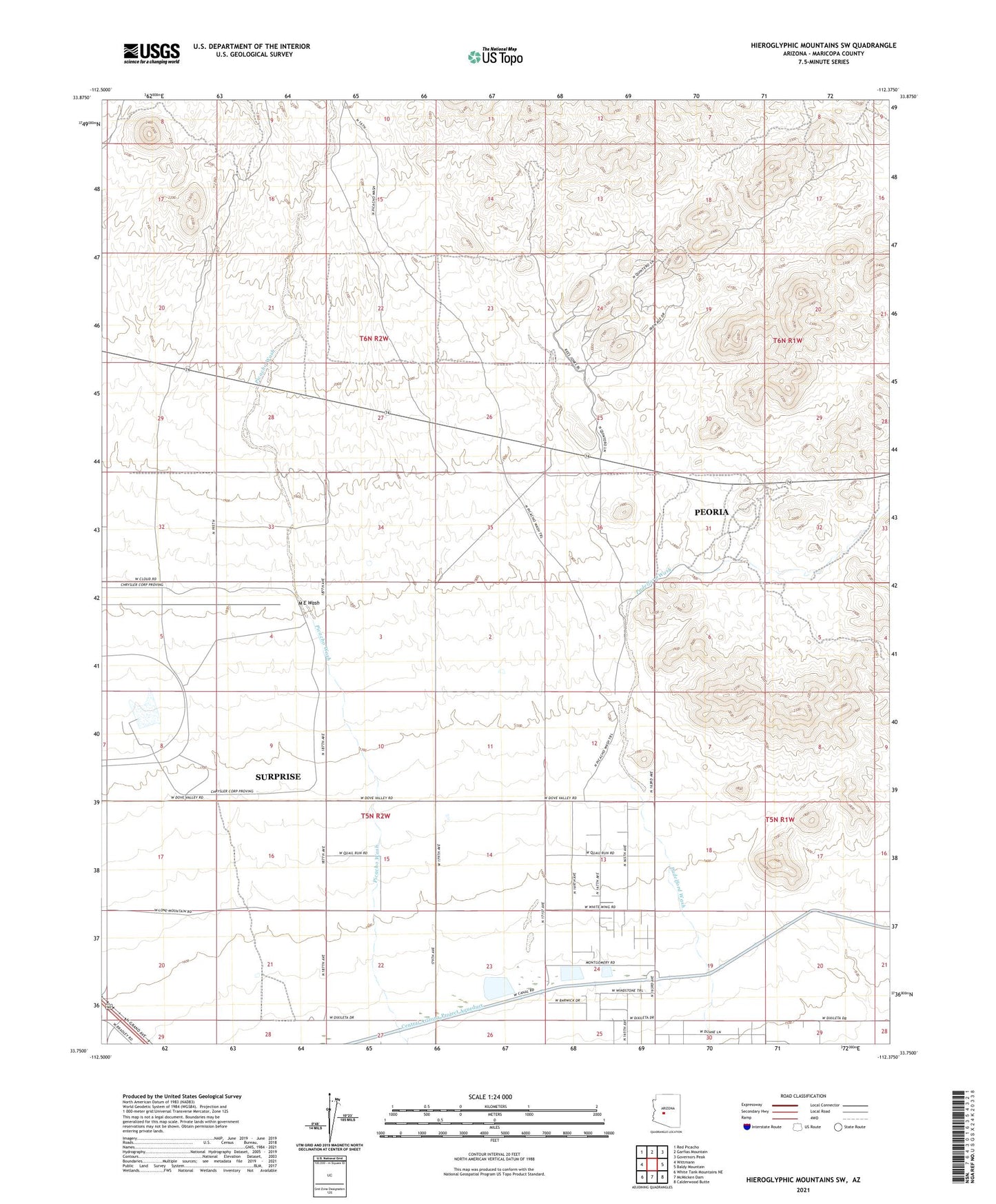 2021 topographic map quadrangle Hieroglyphic Mountains SW in the state of Arizona. Scale: 1:24000. Based on the newly updated USGS 7.5' US Topo map series, this map is in the following counties: Maricopa. The map contains contour data, water features, and other items you are used to seeing on USGS maps, but also has updated roads and other features. This is the next generation of topographic maps. Printed on high-quality waterproof paper with UV fade-resistant inks.