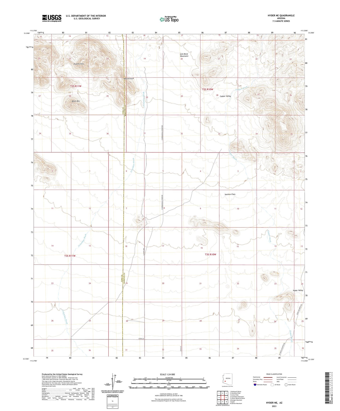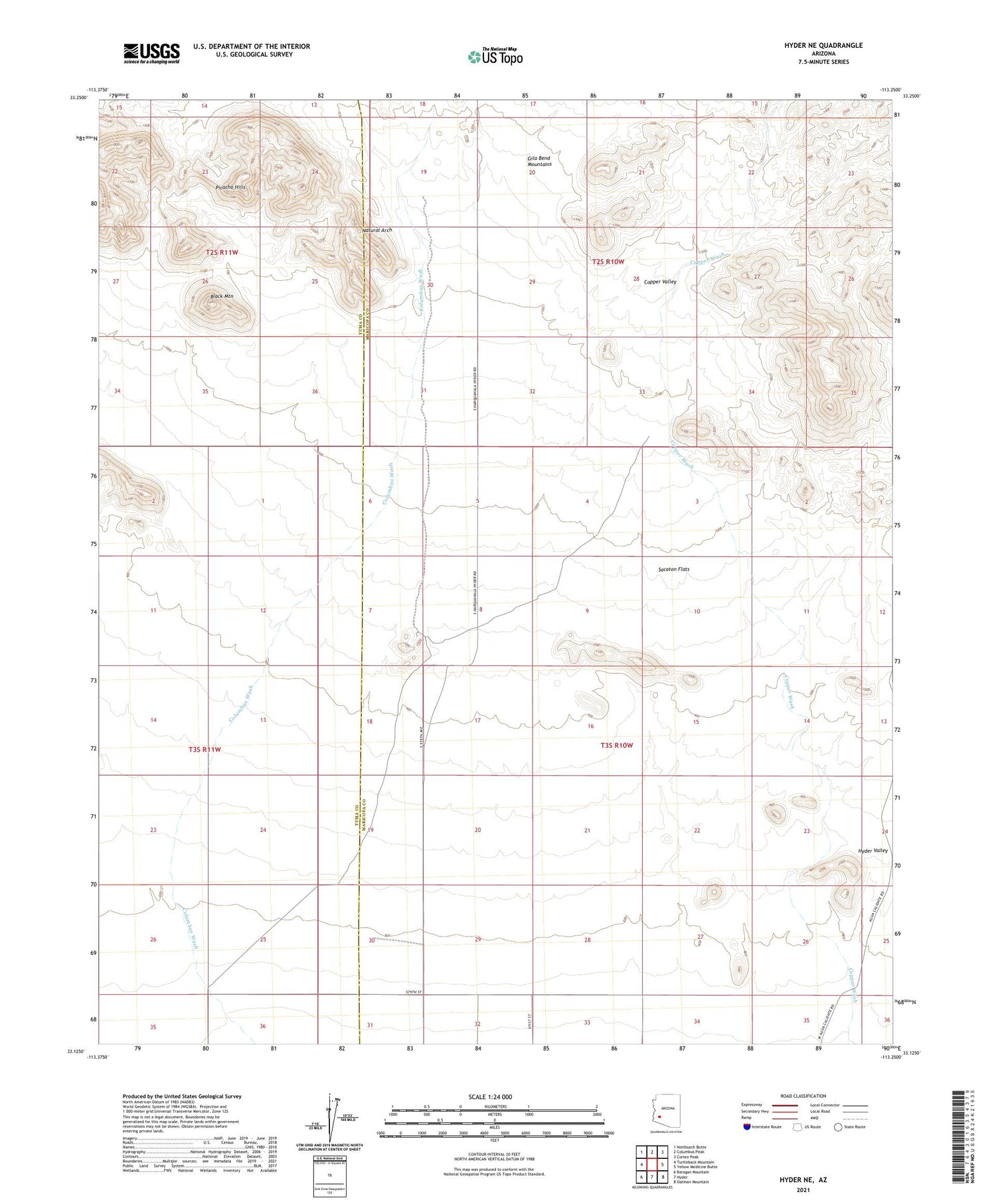 2021 topographic map quadrangle Hyder NE in the state of Arizona. Scale: 1:24000. Based on the newly updated USGS 7.5' US Topo map series, this map is in the following counties: Maricopa, Yuma. The map contains contour data, water features, and other items you are used to seeing on USGS maps, but also has updated roads and other features. This is the next generation of topographic maps. Printed on high-quality waterproof paper with UV fade-resistant inks.
