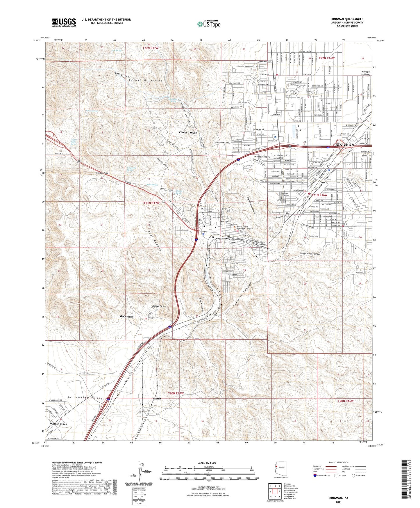 2021 topographic map quadrangle Kingman in the state of Arizona. Scale: 1:24000. Based on the newly updated USGS 7.5' US Topo map series, this map is in the following counties: Mohave. The map contains contour data, water features, and other items you are used to seeing on USGS maps, but also has updated roads and other features. This is the next generation of topographic maps. Printed on high-quality waterproof paper with UV fade-resistant inks.