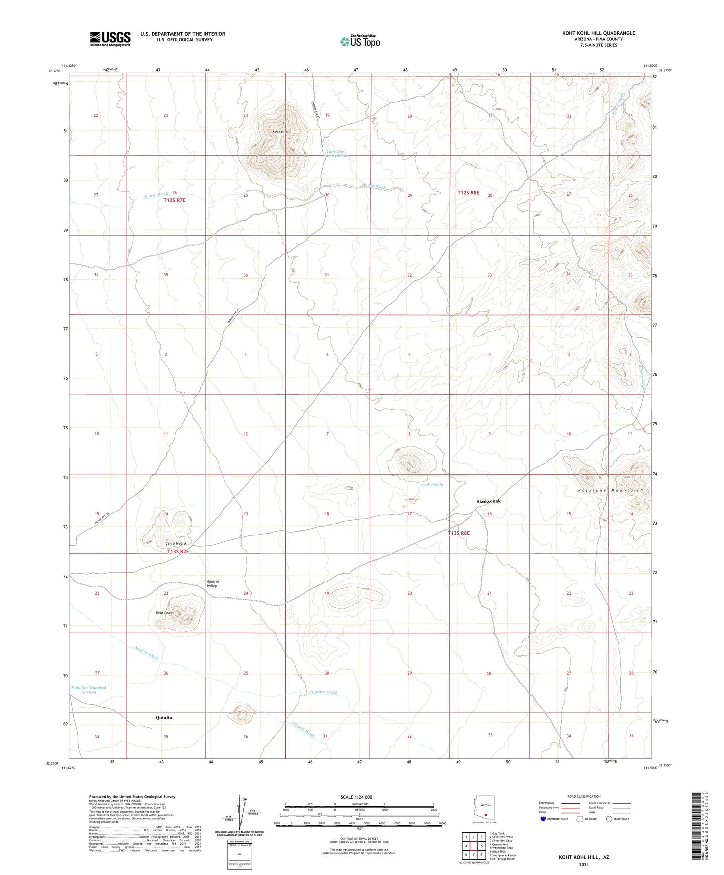 2021 topographic map quadrangle Koht Kohl Hill in the state of Arizona. Scale: 1:24000. Based on the newly updated USGS 7.5' US Topo map series, this map is in the following counties: Pima. The map contains contour data, water features, and other items you are used to seeing on USGS maps, but also has updated roads and other features. This is the next generation of topographic maps. Printed on high-quality waterproof paper with UV fade-resistant inks.