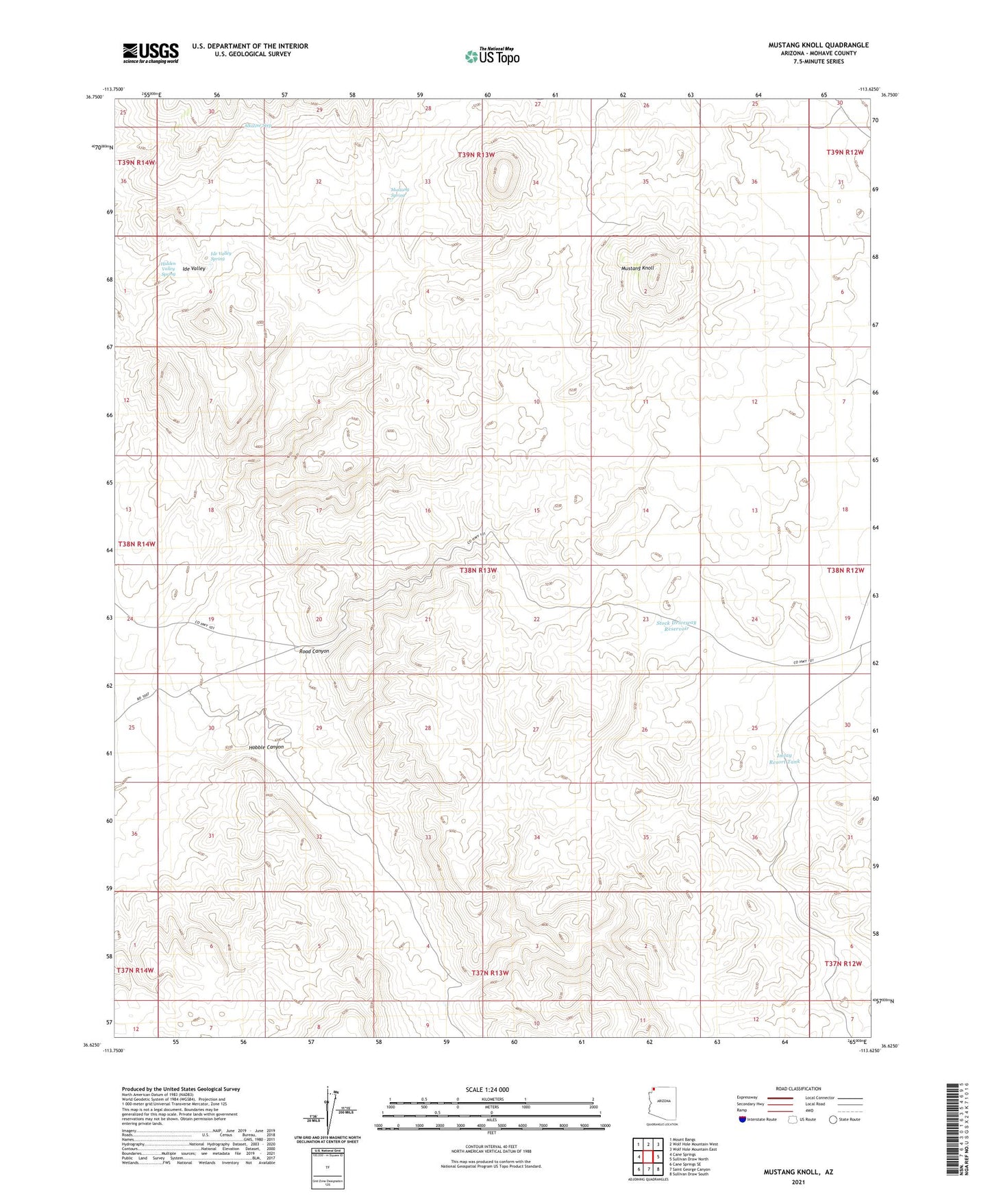 2021 topographic map quadrangle Mustang Knoll in the state of Arizona. Scale: 1:24000. Based on the newly updated USGS 7.5' US Topo map series, this map is in the following counties: Mohave. The map contains contour data, water features, and other items you are used to seeing on USGS maps, but also has updated roads and other features. This is the next generation of topographic maps. Printed on high-quality waterproof paper with UV fade-resistant inks.