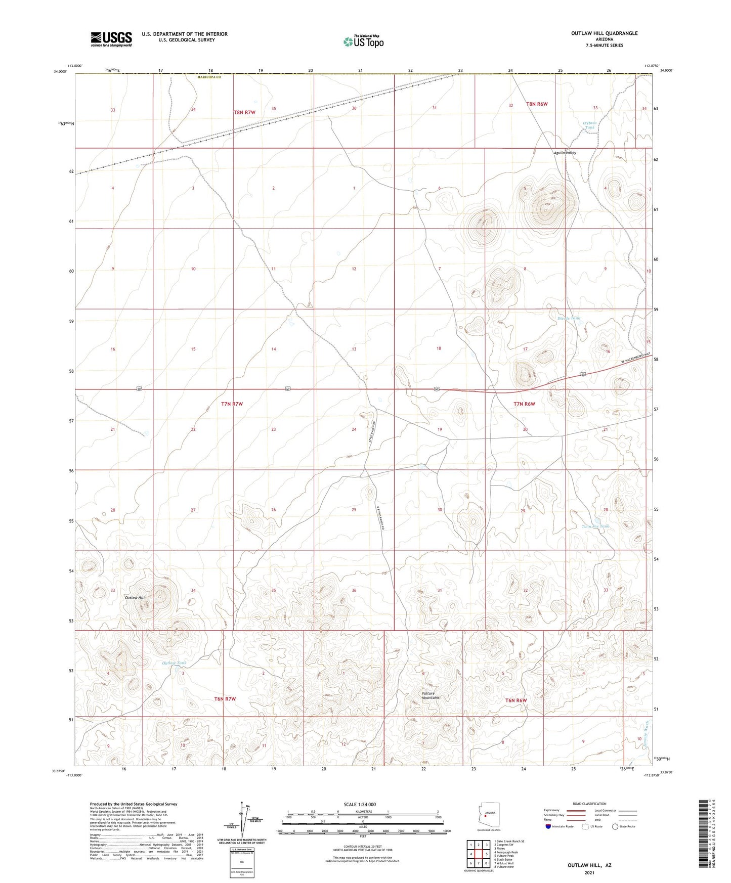 2021 topographic map quadrangle Outlaw Hill in the state of Arizona. Scale: 1:24000. Based on the newly updated USGS 7.5' US Topo map series, this map is in the following counties: Maricopa, Yavapai. The map contains contour data, water features, and other items you are used to seeing on USGS maps, but also has updated roads and other features. This is the next generation of topographic maps. Printed on high-quality waterproof paper with UV fade-resistant inks.