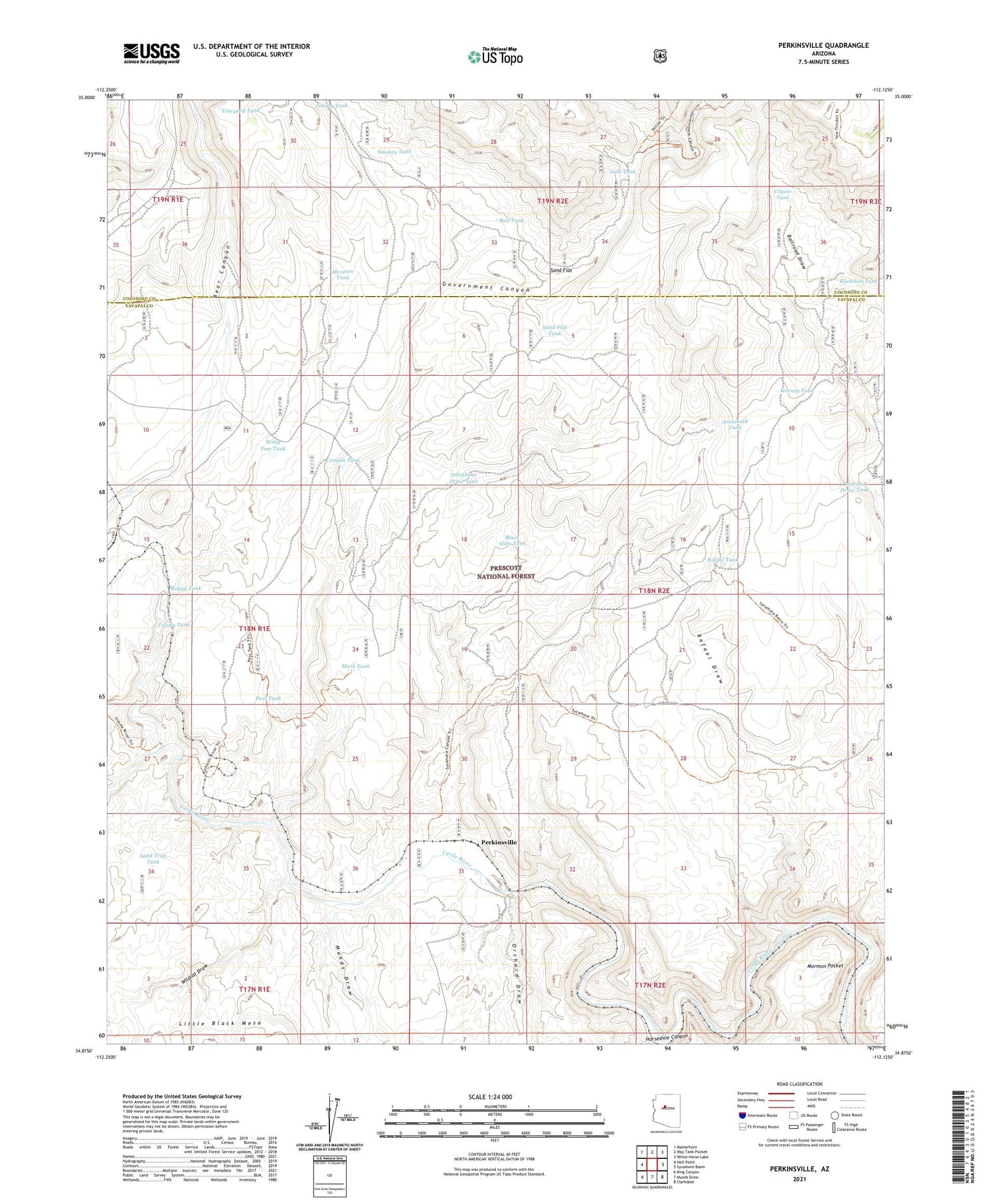 2021 topographic map quadrangle Perkinsville in the state of Arizona. Scale: 1:24000. Based on the newly updated USGS 7.5' US Topo map series, this map is in the following counties: Yavapai, Coconino. The map contains contour data, water features, and other items you are used to seeing on USGS maps, but also has updated roads and other features. This is the next generation of topographic maps. Printed on high-quality waterproof paper with UV fade-resistant inks.