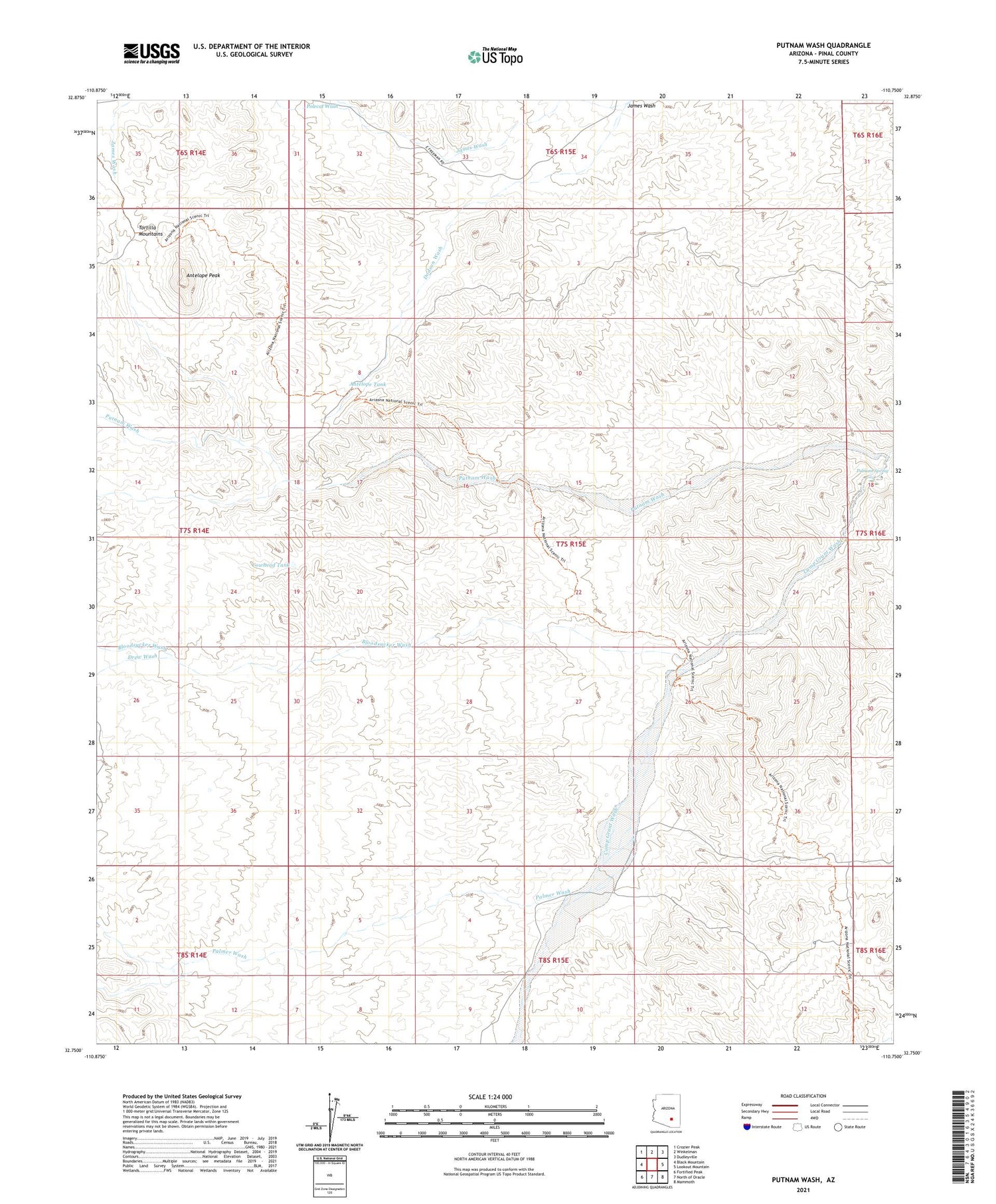 2021 topographic map quadrangle Putnam Wash in the state of Arizona. Scale: 1:24000. Based on the newly updated USGS 7.5' US Topo map series, this map is in the following counties: Pinal. The map contains contour data, water features, and other items you are used to seeing on USGS maps, but also has updated roads and other features. This is the next generation of topographic maps. Printed on high-quality waterproof paper with UV fade-resistant inks.