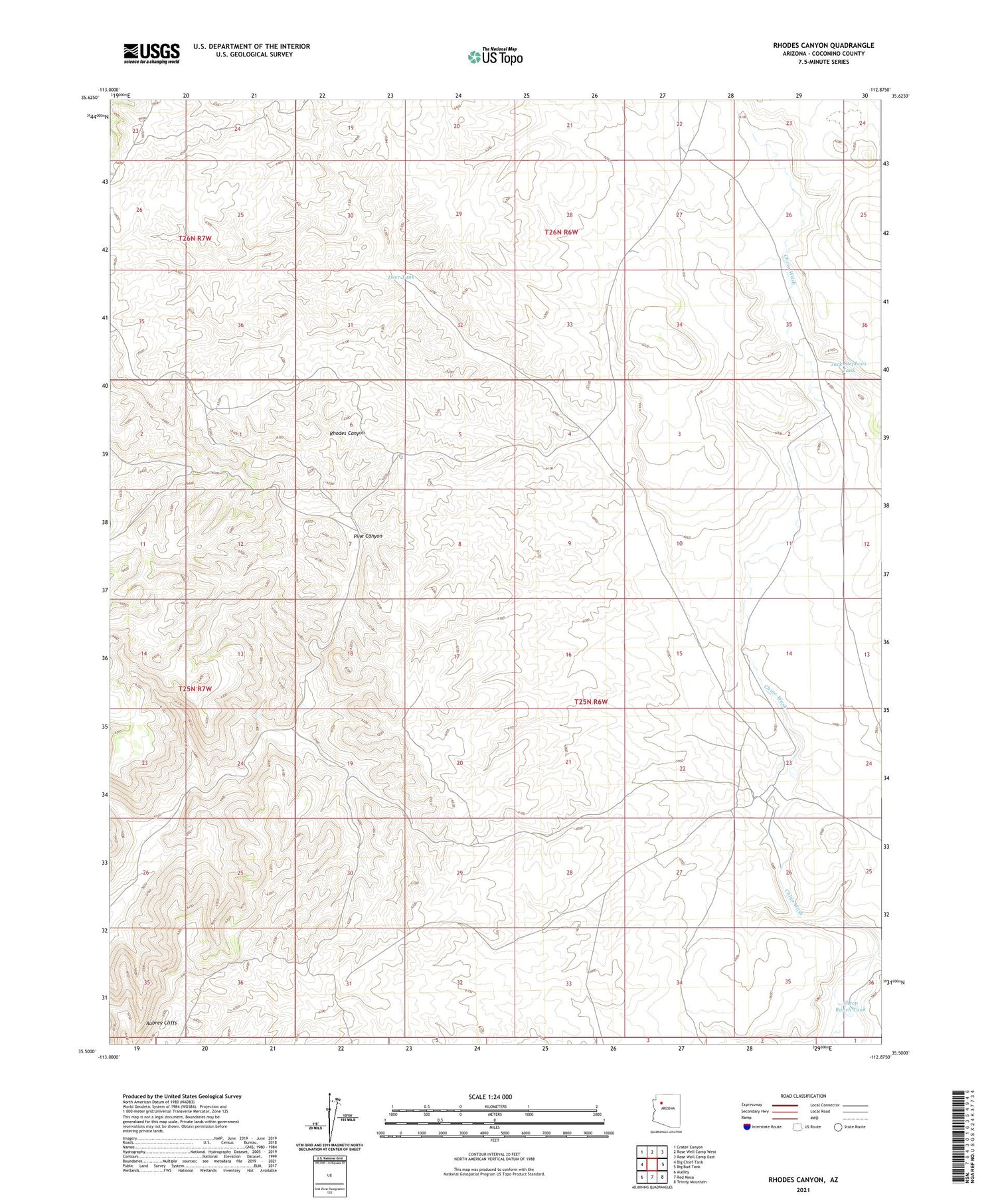 2021 topographic map quadrangle Rhodes Canyon in the state of Arizona. Scale: 1:24000. Based on the newly updated USGS 7.5' US Topo map series, this map is in the following counties: Coconino. The map contains contour data, water features, and other items you are used to seeing on USGS maps, but also has updated roads and other features. This is the next generation of topographic maps. Printed on high-quality waterproof paper with UV fade-resistant inks.