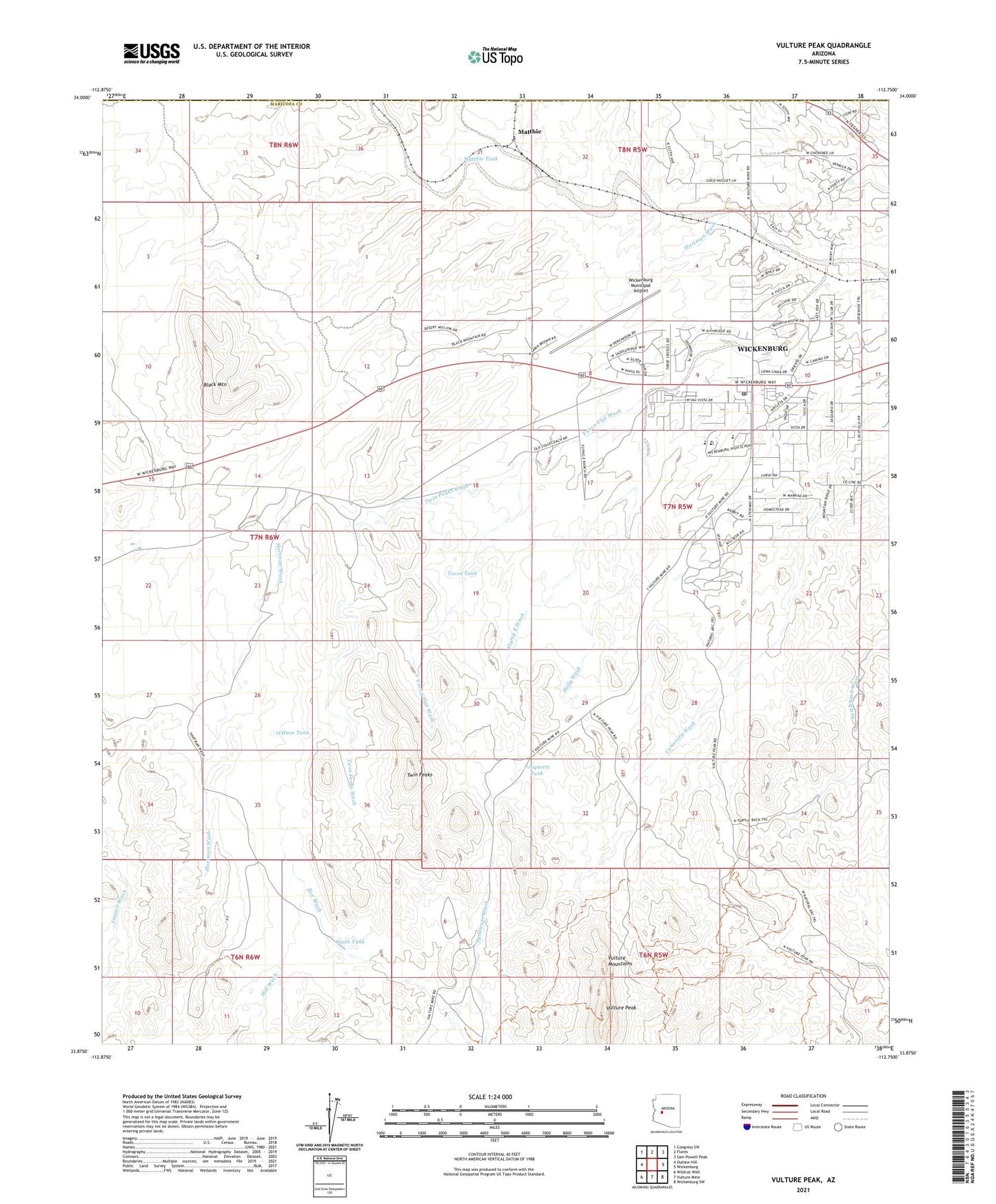 2021 topographic map quadrangle Vulture Peak in the state of Arizona. Scale: 1:24000. Based on the newly updated USGS 7.5' US Topo map series, this map is in the following counties: Maricopa, Yavapai. The map contains contour data, water features, and other items you are used to seeing on USGS maps, but also has updated roads and other features. This is the next generation of topographic maps. Printed on high-quality waterproof paper with UV fade-resistant inks.
