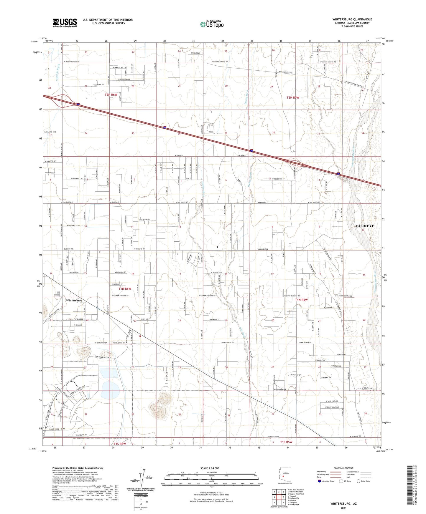 2021 topographic map quadrangle Wintersburg in the state of Arizona. Scale: 1:24000. Based on the newly updated USGS 7.5' US Topo map series, this map is in the following counties: Maricopa. The map contains contour data, water features, and other items you are used to seeing on USGS maps, but also has updated roads and other features. This is the next generation of topographic maps. Printed on high-quality waterproof paper with UV fade-resistant inks.