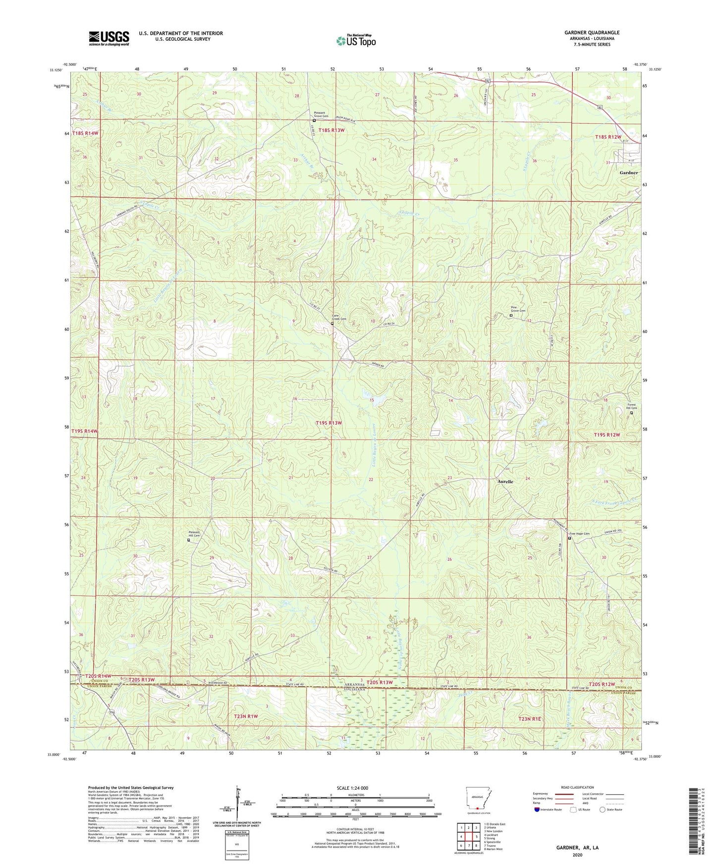 2024 topographic map quadrangle Gardner in the state of Arkansas. Scale: 1:24000. Based on the newly updated USGS 7.5' US Topo map series, this map is in the following counties: Union. The map contains contour data, water features, and other items you are used to seeing on USGS maps, but also has updated roads and other features. This is the next generation of topographic maps. Printed on high-quality waterproof paper with UV fade-resistant inks.