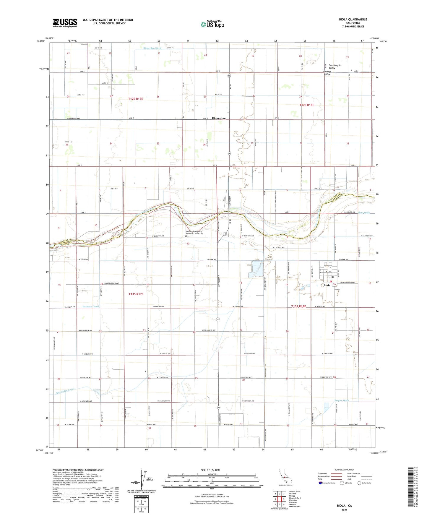 2021 topographic map quadrangle Biola in the state of California. Scale: 1:24000. Based on the newly updated USGS 7.5' US Topo map series, this map is in the following counties: Fresno, Madera. The map contains contour data, water features, and other items you are used to seeing on USGS maps, but also has updated roads and other features. This is the next generation of topographic maps. Printed on high-quality waterproof paper with UV fade-resistant inks.