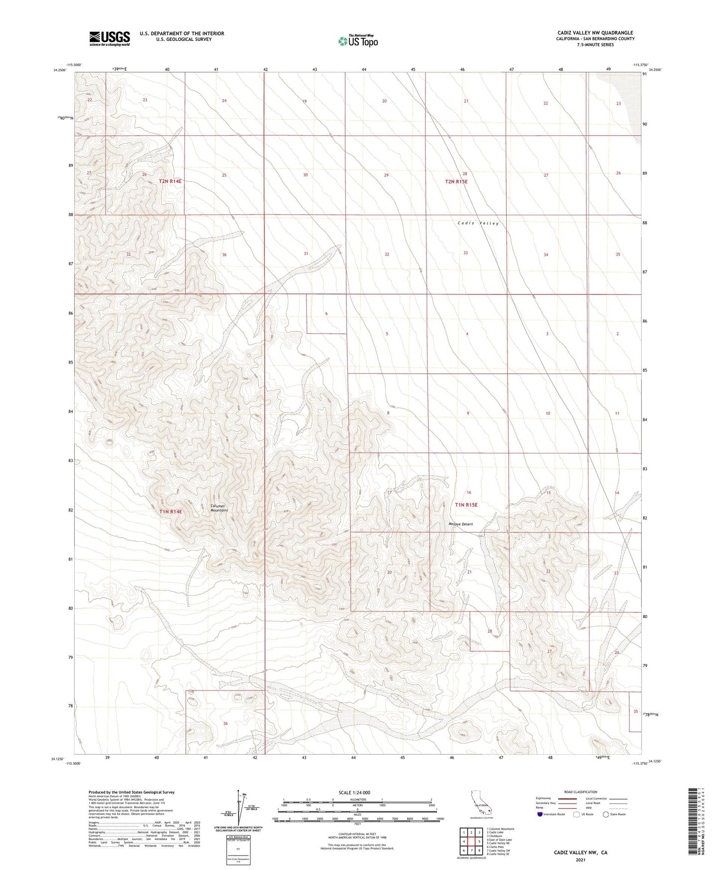 2021 topographic map quadrangle Cadiz Valley NW in the state of California. Scale: 1:24000. Based on the newly updated USGS 7.5' US Topo map series, this map is in the following counties: San Bernardino. The map contains contour data, water features, and other items you are used to seeing on USGS maps, but also has updated roads and other features. This is the next generation of topographic maps. Printed on high-quality waterproof paper with UV fade-resistant inks.