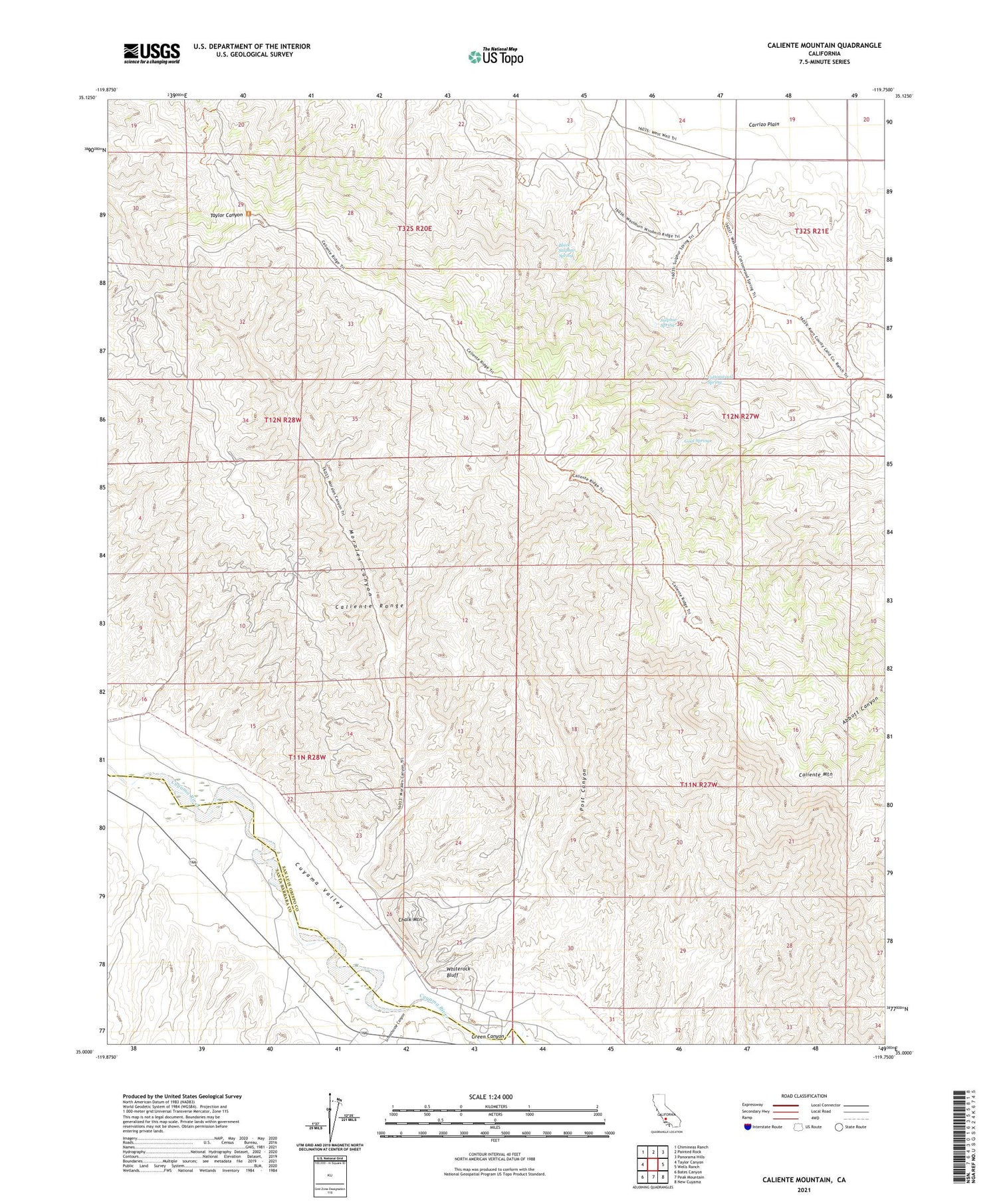 2021 topographic map quadrangle Caliente Mountain in the state of California. Scale: 1:24000. Based on the newly updated USGS 7.5' US Topo map series, this map is in the following counties: San Luis Obispo, Santa Barbara. The map contains contour data, water features, and other items you are used to seeing on USGS maps, but also has updated roads and other features. This is the next generation of topographic maps. Printed on high-quality waterproof paper with UV fade-resistant inks.