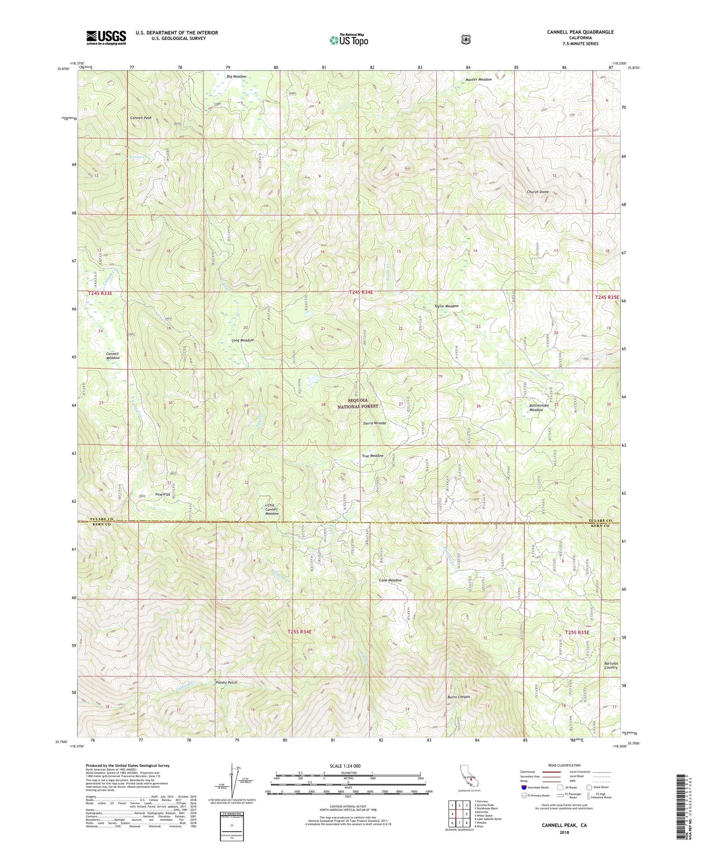2021 topographic map quadrangle Cannell Peak in the state of California. Scale: 1:24000. Based on the newly updated USGS 7.5' US Topo map series, this map is in the following counties: Tulare, Kern. The map contains contour data, water features, and other items you are used to seeing on USGS maps, but also has updated roads and other features. This is the next generation of topographic maps. Printed on high-quality waterproof paper with UV fade-resistant inks.