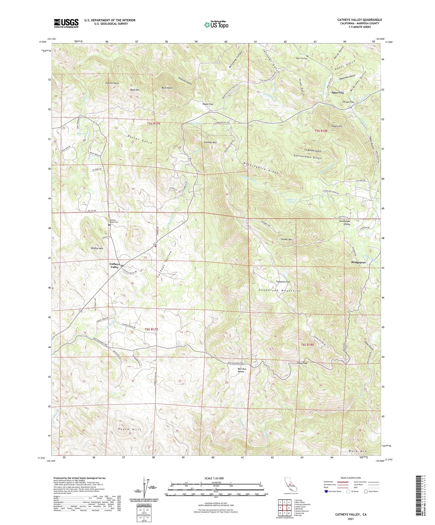 2021 topographic map quadrangle Catheys Valley in the state of California. Scale: 1:24000. Based on the newly updated USGS 7.5' US Topo map series, this map is in the following counties: Mariposa. The map contains contour data, water features, and other items you are used to seeing on USGS maps, but also has updated roads and other features. This is the next generation of topographic maps. Printed on high-quality waterproof paper with UV fade-resistant inks.