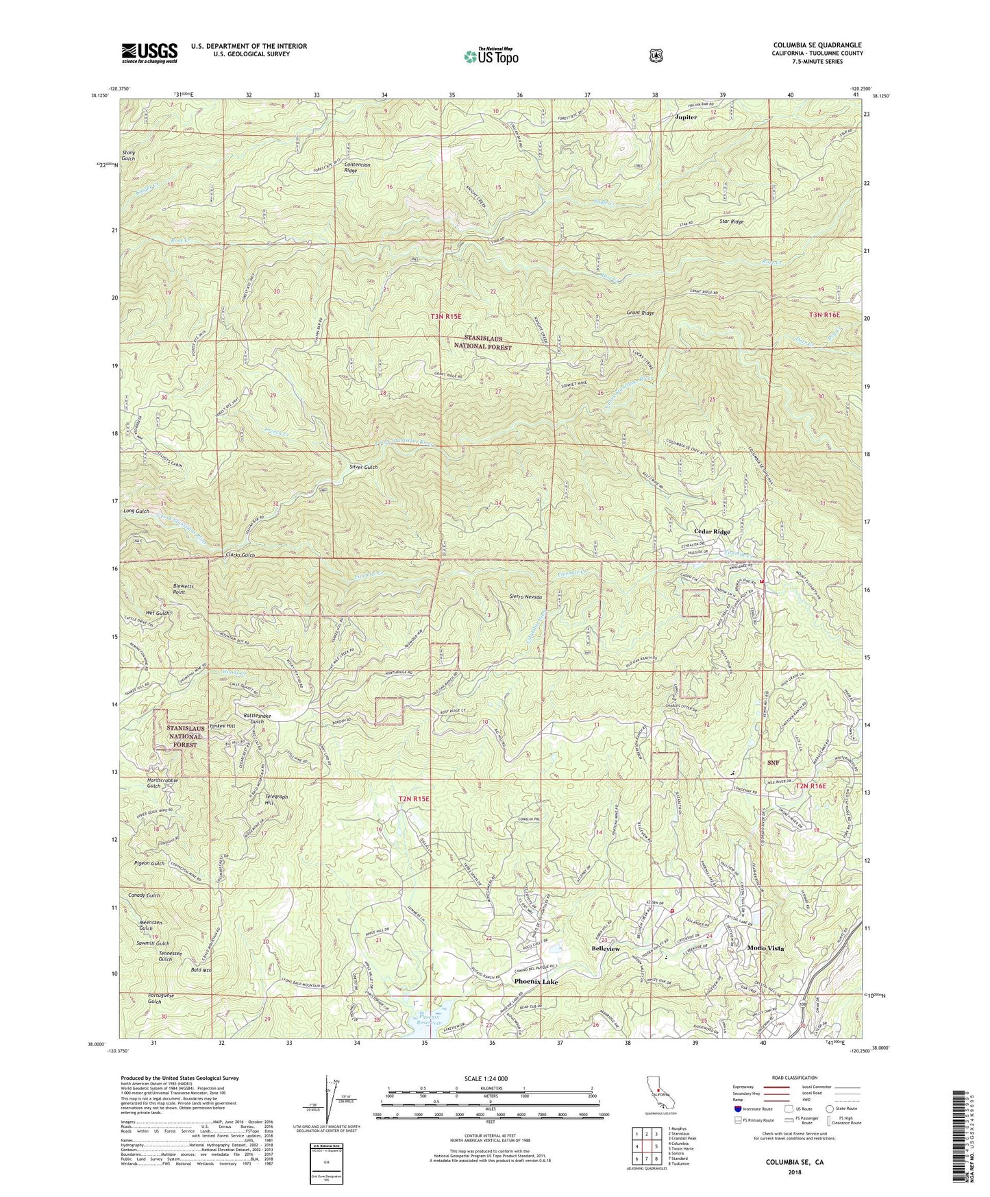 2021 topographic map quadrangle Columbia SE in the state of California. Scale: 1:24000. Based on the newly updated USGS 7.5' US Topo map series, this map is in the following counties: Tuolumne. The map contains contour data, water features, and other items you are used to seeing on USGS maps, but also has updated roads and other features. This is the next generation of topographic maps. Printed on high-quality waterproof paper with UV fade-resistant inks.