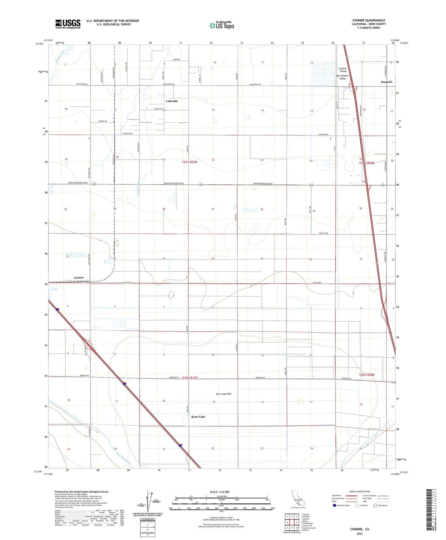 2021 topographic map quadrangle Conner in the state of California. Scale: 1:24000. Based on the newly updated USGS 7.5' US Topo map series, this map is in the following counties: Kern. The map contains contour data, water features, and other items you are used to seeing on USGS maps, but also has updated roads and other features. This is the next generation of topographic maps. Printed on high-quality waterproof paper with UV fade-resistant inks.