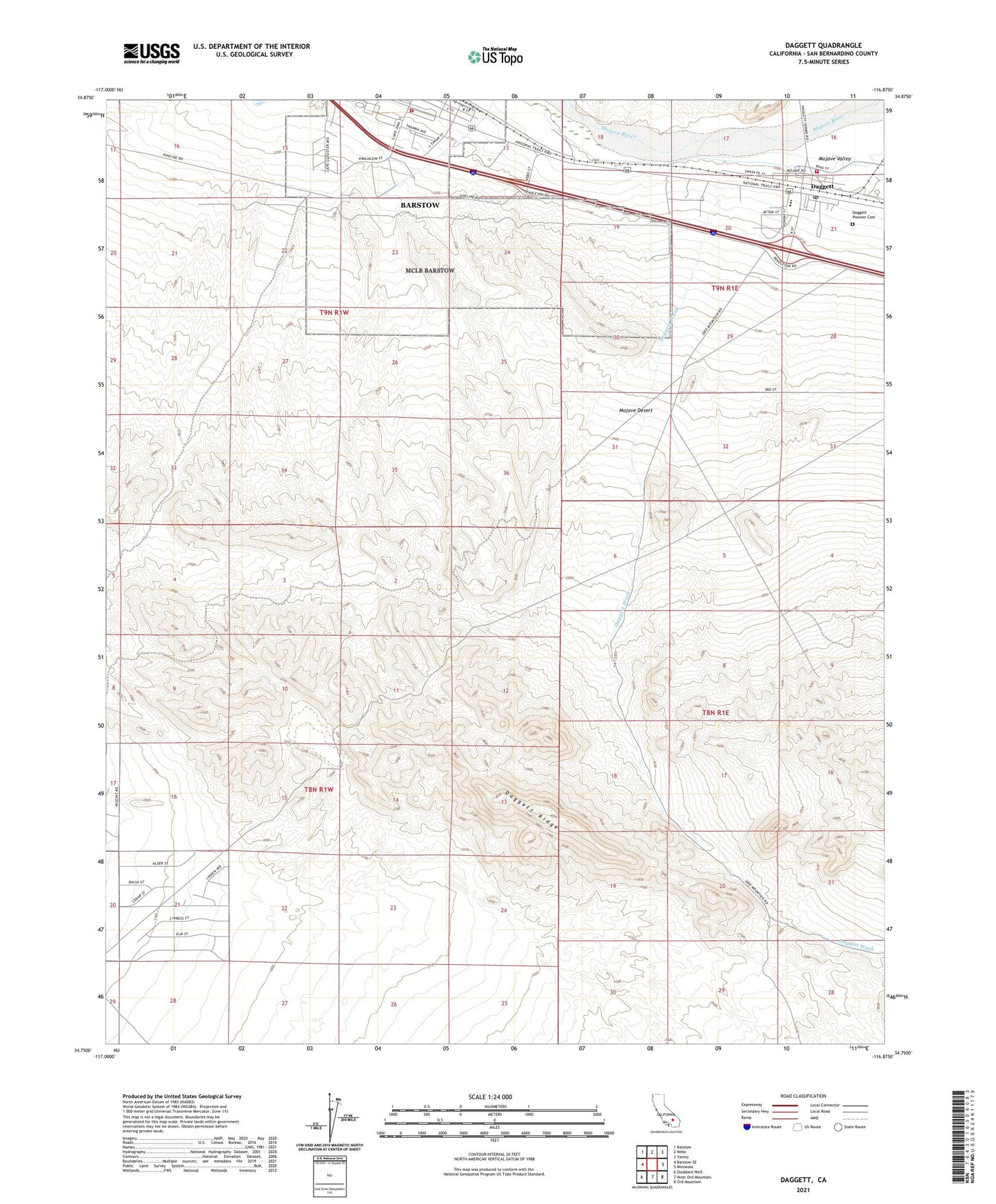 2021 topographic map quadrangle Daggett in the state of California. Scale: 1:24000. Based on the newly updated USGS 7.5' US Topo map series, this map is in the following counties: San Bernardino. The map contains contour data, water features, and other items you are used to seeing on USGS maps, but also has updated roads and other features. This is the next generation of topographic maps. Printed on high-quality waterproof paper with UV fade-resistant inks.