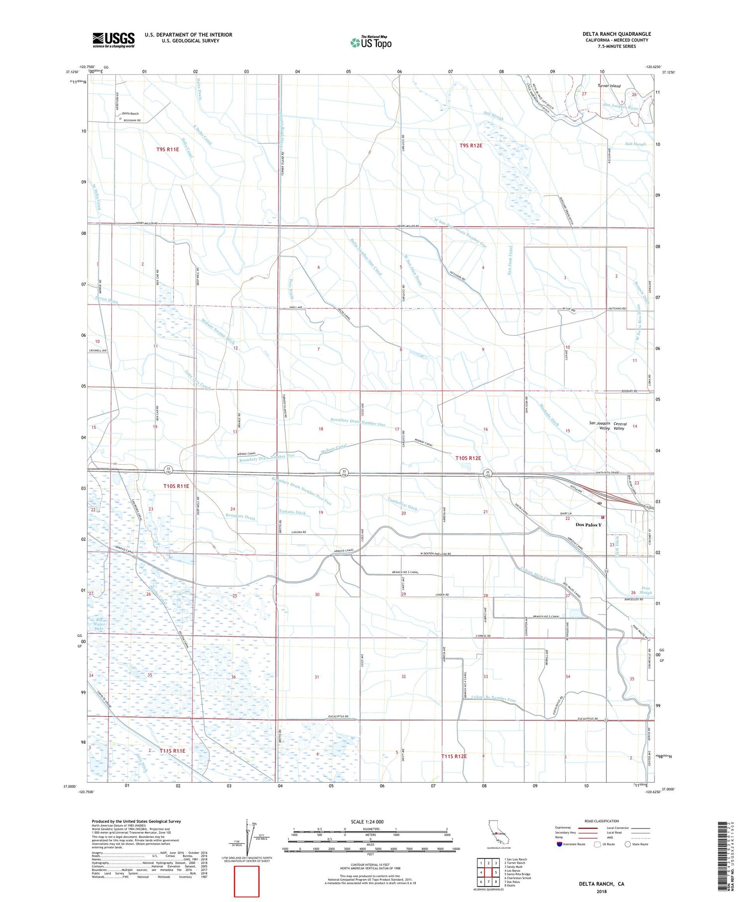 2021 topographic map quadrangle Delta Ranch in the state of California. Scale: 1:24000. Based on the newly updated USGS 7.5' US Topo map series, this map is in the following counties: Merced. The map contains contour data, water features, and other items you are used to seeing on USGS maps, but also has updated roads and other features. This is the next generation of topographic maps. Printed on high-quality waterproof paper with UV fade-resistant inks.