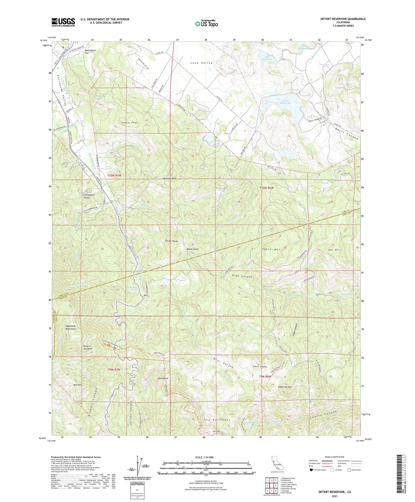 2021 topographic map quadrangle Detert Reservoir in the state of California. Scale: 1:24000. Based on the newly updated USGS 7.5' US Topo map series, this map is in the following counties: Lake, Napa, Sonoma. The map contains contour data, water features, and other items you are used to seeing on USGS maps, but also has updated roads and other features. This is the next generation of topographic maps. Printed on high-quality waterproof paper with UV fade-resistant inks.