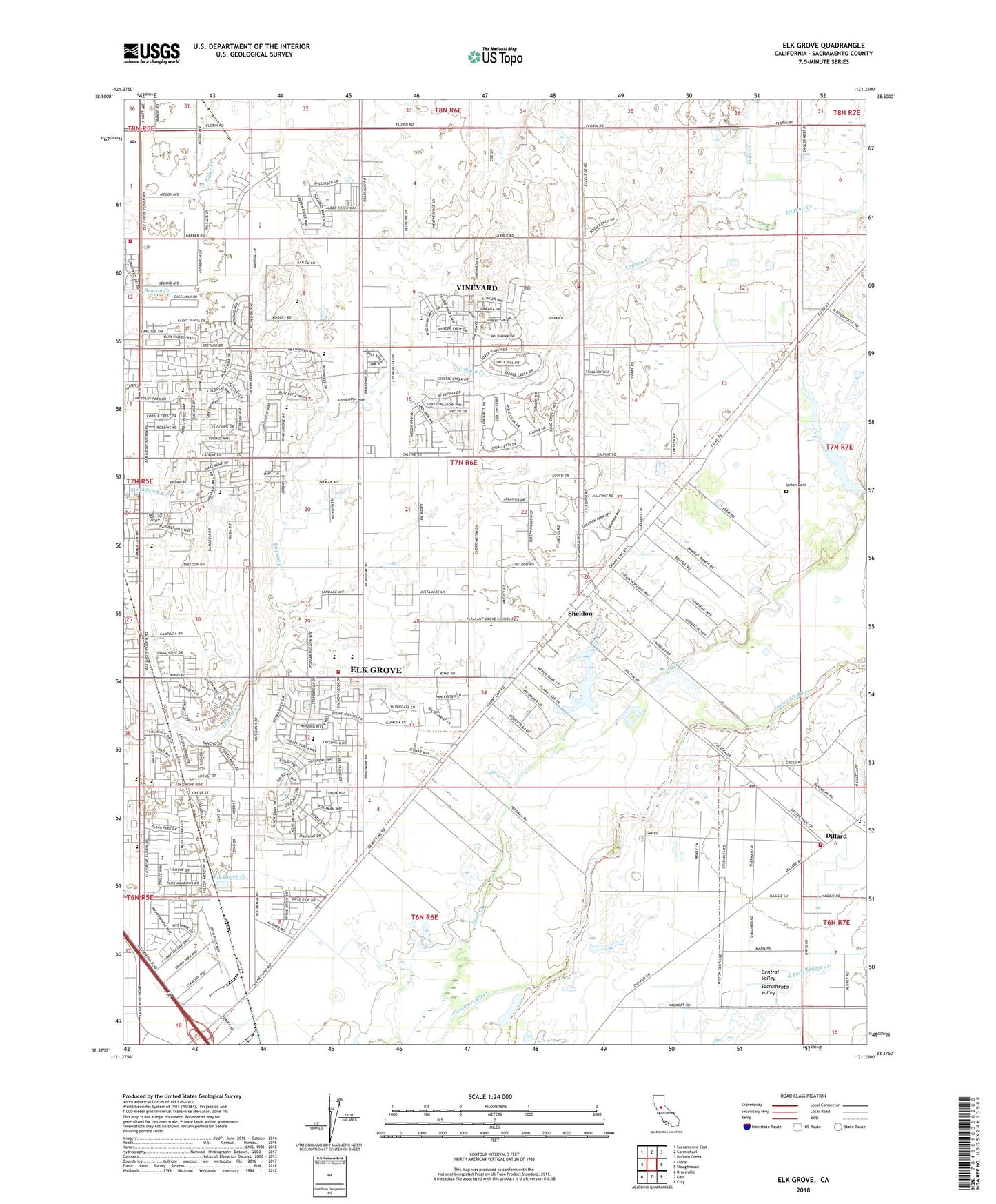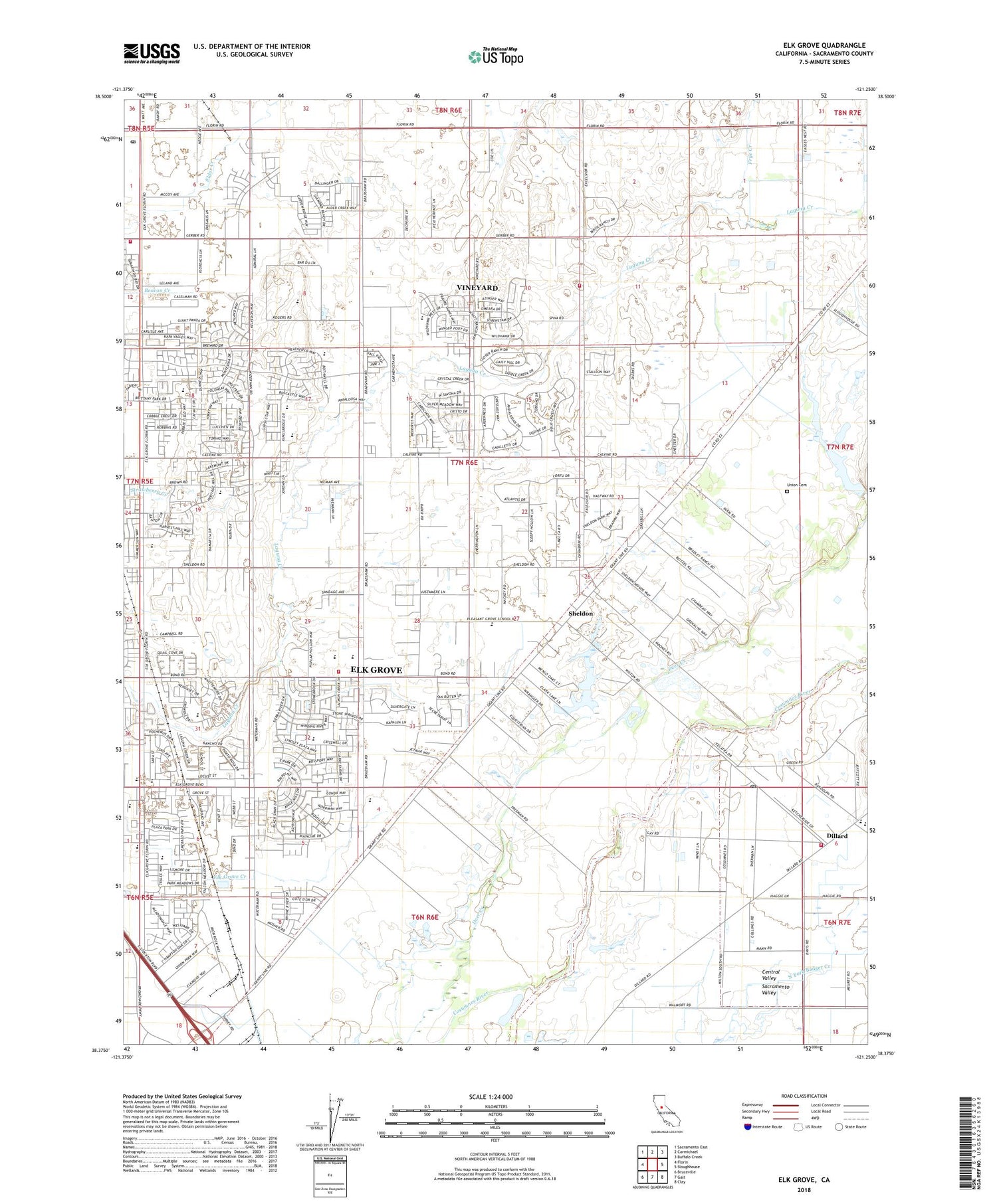 2022 topographic map quadrangle Elk Grove in the state of California. Scale: 1:24000. Based on the newly updated USGS 7.5' US Topo map series, this map is in the following counties: Sacramento. The map contains contour data, water features, and other items you are used to seeing on USGS maps, but also has updated roads and other features. This is the next generation of topographic maps. Printed on high-quality waterproof paper with UV fade-resistant inks.
