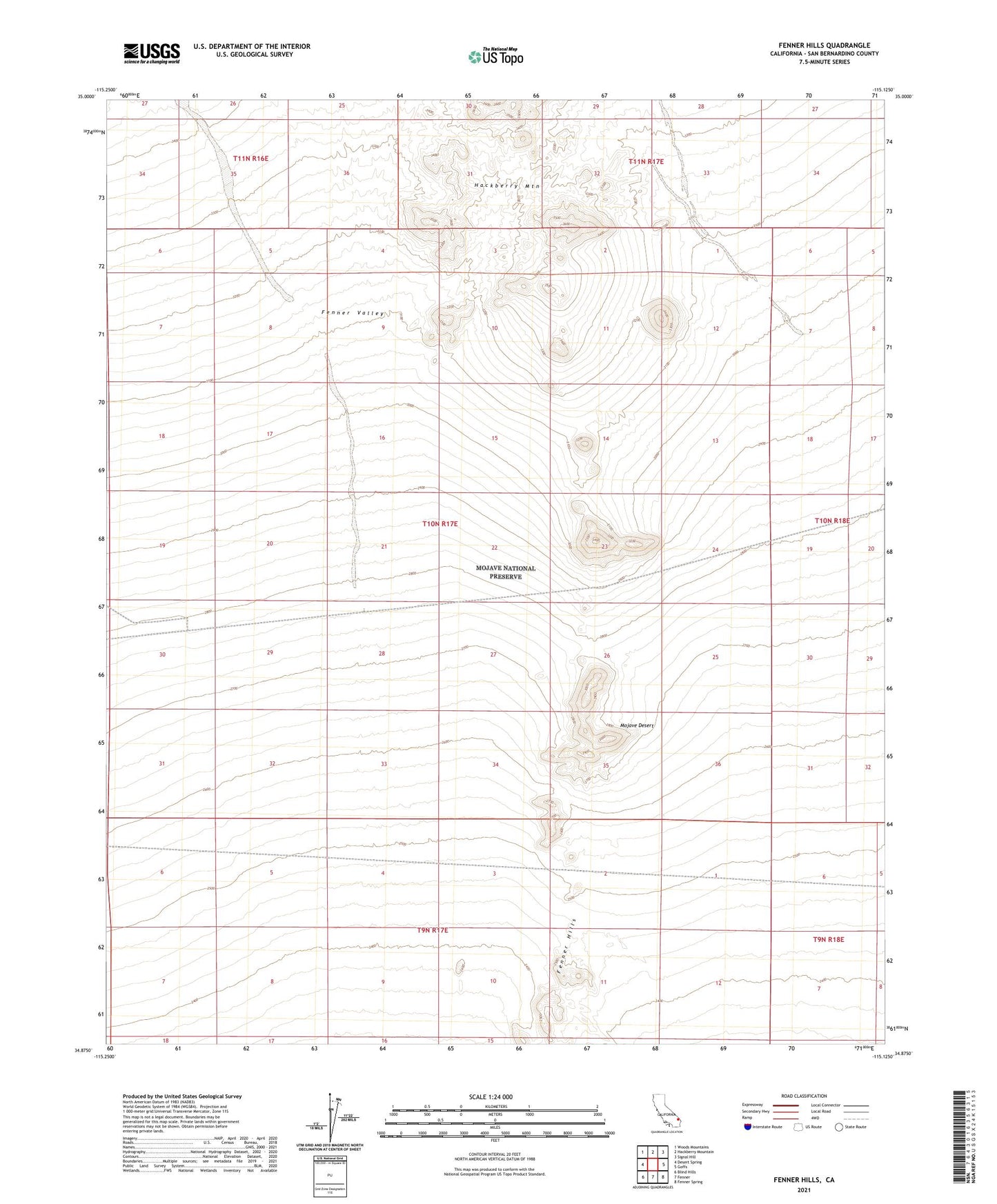 2021 topographic map quadrangle Fenner Hills in the state of California. Scale: 1:24000. Based on the newly updated USGS 7.5' US Topo map series, this map is in the following counties: San Bernardino. The map contains contour data, water features, and other items you are used to seeing on USGS maps, but also has updated roads and other features. This is the next generation of topographic maps. Printed on high-quality waterproof paper with UV fade-resistant inks.