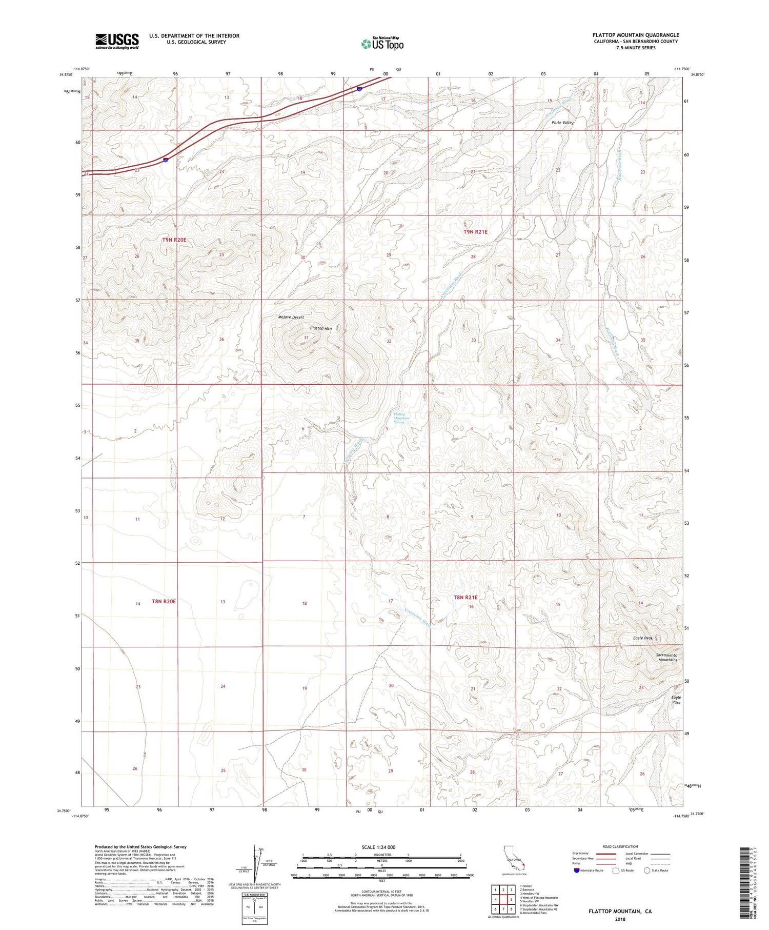 2021 topographic map quadrangle Flattop Mountain in the state of California. Scale: 1:24000. Based on the newly updated USGS 7.5' US Topo map series, this map is in the following counties: San Bernardino. The map contains contour data, water features, and other items you are used to seeing on USGS maps, but also has updated roads and other features. This is the next generation of topographic maps. Printed on high-quality waterproof paper with UV fade-resistant inks.