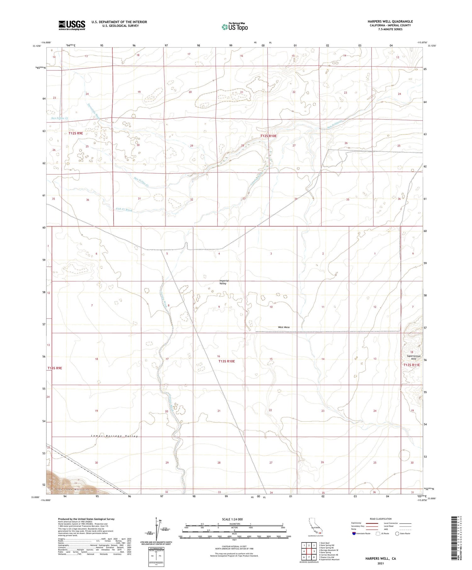 2021 topographic map quadrangle Harpers Well in the state of California. Scale: 1:24000. Based on the newly updated USGS 7.5' US Topo map series, this map is in the following counties: Imperial. The map contains contour data, water features, and other items you are used to seeing on USGS maps, but also has updated roads and other features. This is the next generation of topographic maps. Printed on high-quality waterproof paper with UV fade-resistant inks.