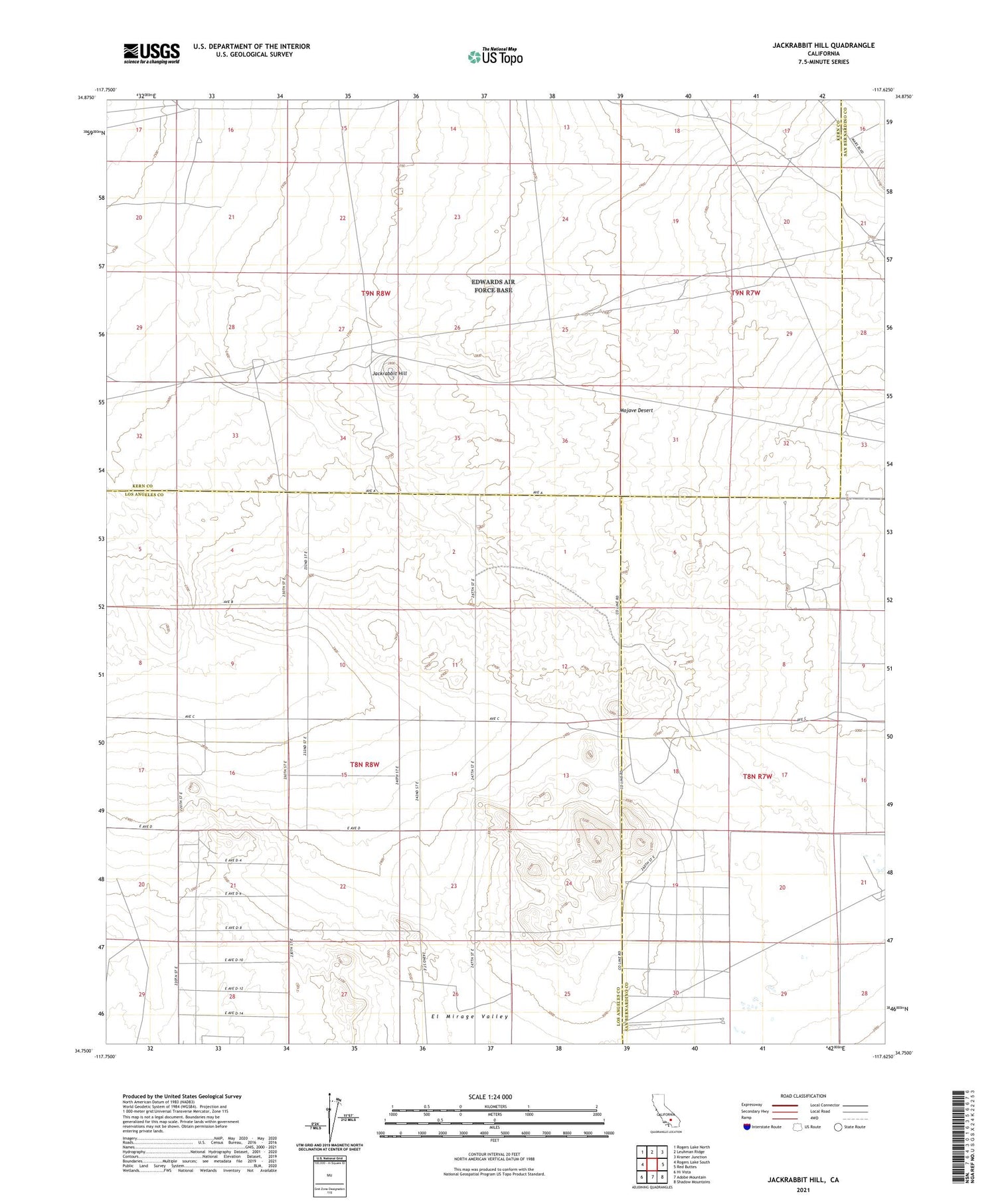 2021 topographic map quadrangle Jackrabbit Hill in the state of California. Scale: 1:24000. Based on the newly updated USGS 7.5' US Topo map series, this map is in the following counties: Los Angeles, Kern, San Bernardino. The map contains contour data, water features, and other items you are used to seeing on USGS maps, but also has updated roads and other features. This is the next generation of topographic maps. Printed on high-quality waterproof paper with UV fade-resistant inks.
