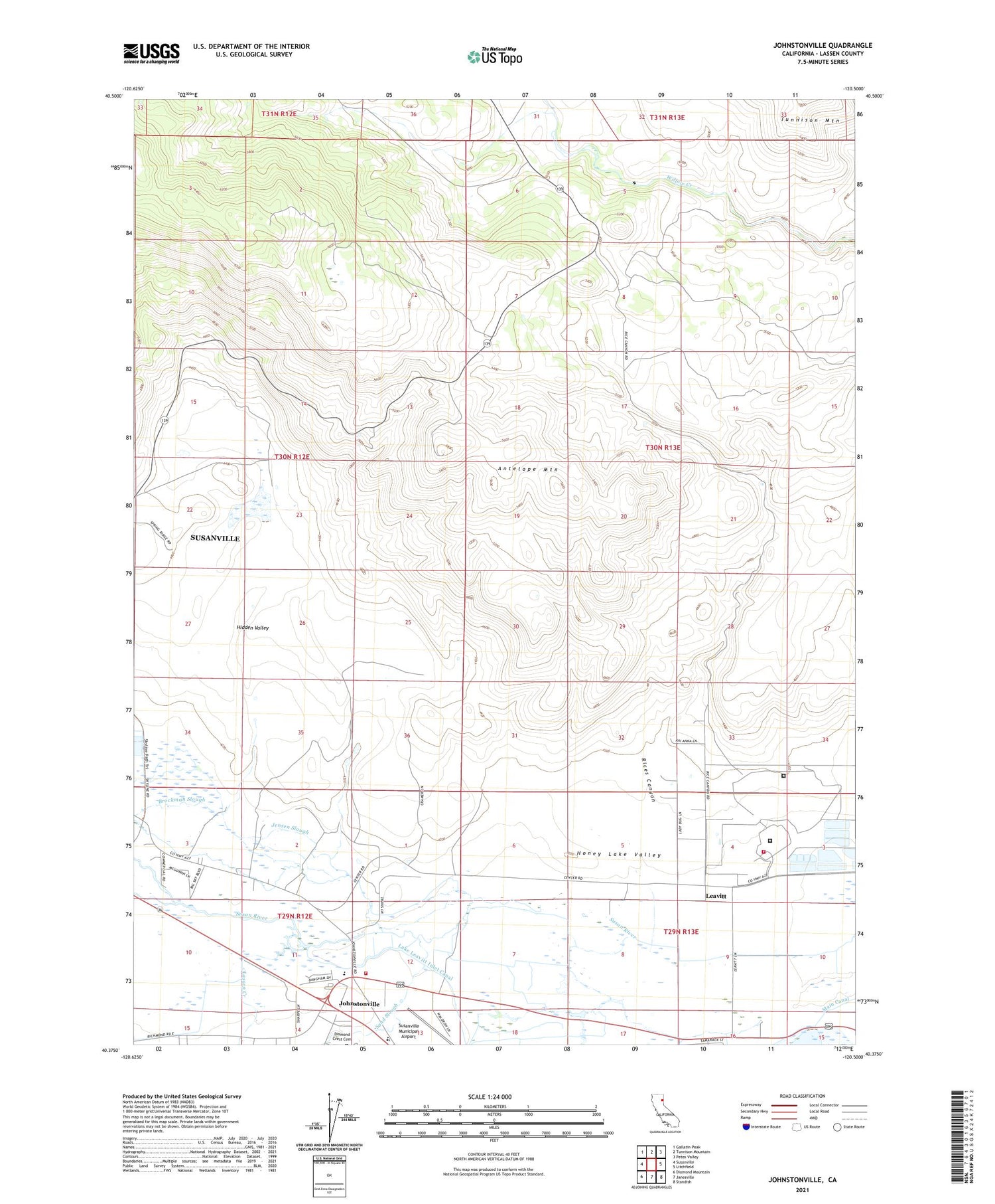 2021 topographic map quadrangle Johnstonville in the state of California. Scale: 1:24000. Based on the newly updated USGS 7.5' US Topo map series, this map is in the following counties: Lassen. The map contains contour data, water features, and other items you are used to seeing on USGS maps, but also has updated roads and other features. This is the next generation of topographic maps. Printed on high-quality waterproof paper with UV fade-resistant inks.